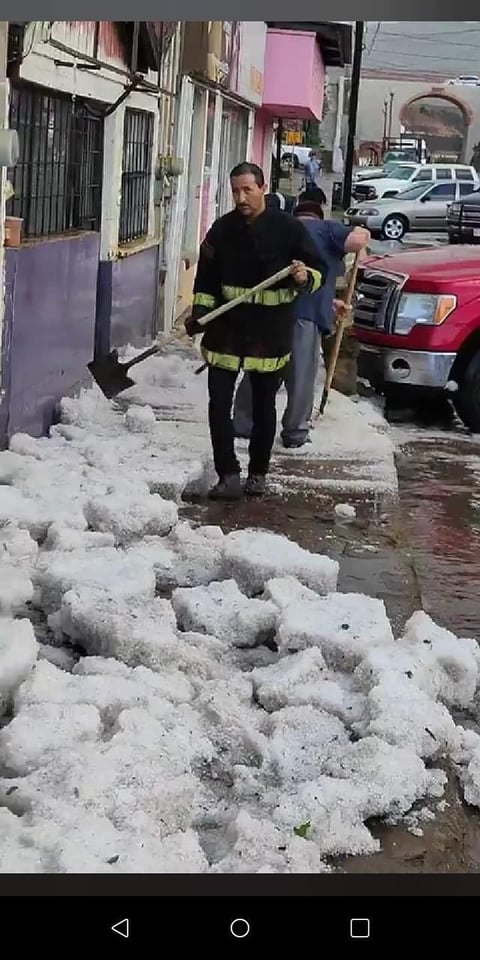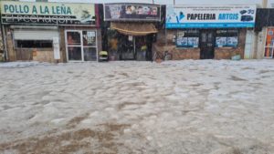 El centro histórico El Ronquillo, también se observó cubierto de blanco por el granizo y locatarios tuvieron que salir a despejar las entradas de sus negocios y las banquetas del hielo.