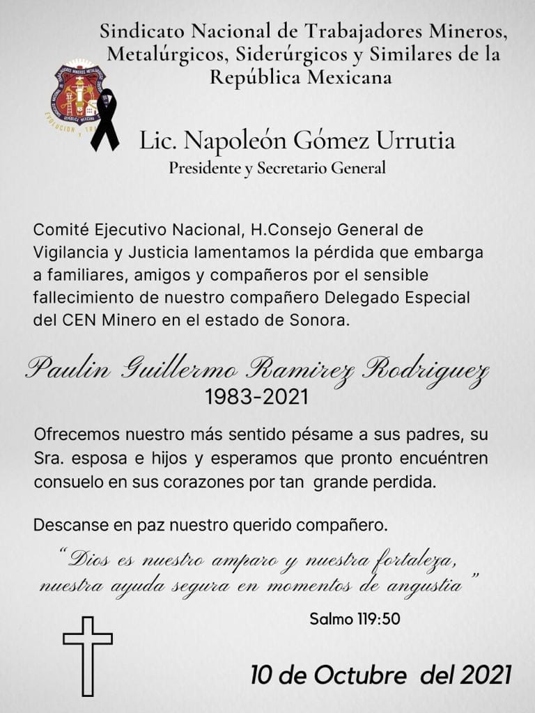 Por su parte, el Presidente y Secretario General Lic. Napoleón Gómez Urrutia, a través de una esquela, lamentó el fallecimiento del Delegado y externó a nombre del todo el gremio minero, condolencias y solidaridad para con los familiares de Paulino Guillermo. Q.E.P.D.