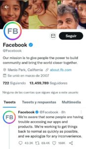 Que el corte en servicio de la empresa de Facebook, propiedad de las otras dos redes sociales, ha provocado que millones de usuarios dejen de recibir mensajes, tengan problemas de acceso y actualización en sus aplicaciones. Por lo que miles de usuarios en España, Estados Unidos, México, Francia, Rumania, Noruega, Georgia, Grecia y otros países han acudido al popular portal Downdetector , para informar de que no podían acceder a los servicios de estas redes sociales.