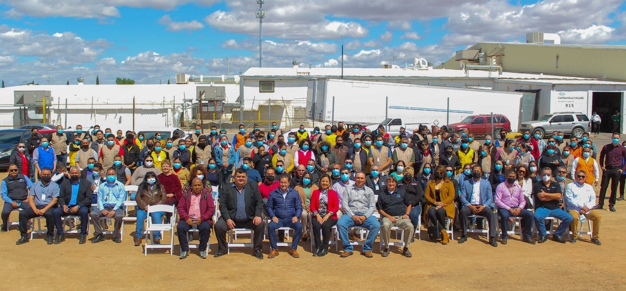 Agua Prieta, Sonora a 30 de marzo de 2022.- Esta tarde el alcalde Jesús Alfonso Montaño Durazo, asistió a la colocación de la primera piedra, acto simbólico que da inicio a la construcción de lo que será una ampliación de la nave industrial de CAPSA Healthcare (RHC, Agua Prieta).