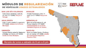 La Secretaría de Seguridad tendrá a disposición módulos de Repuve en San Luis Río Colorado, Nogales, Agua Prieta, Hermosillo, Cajeme y Navojoa en un horario de lunes a sábado de 8:00 a 18:00 horas.