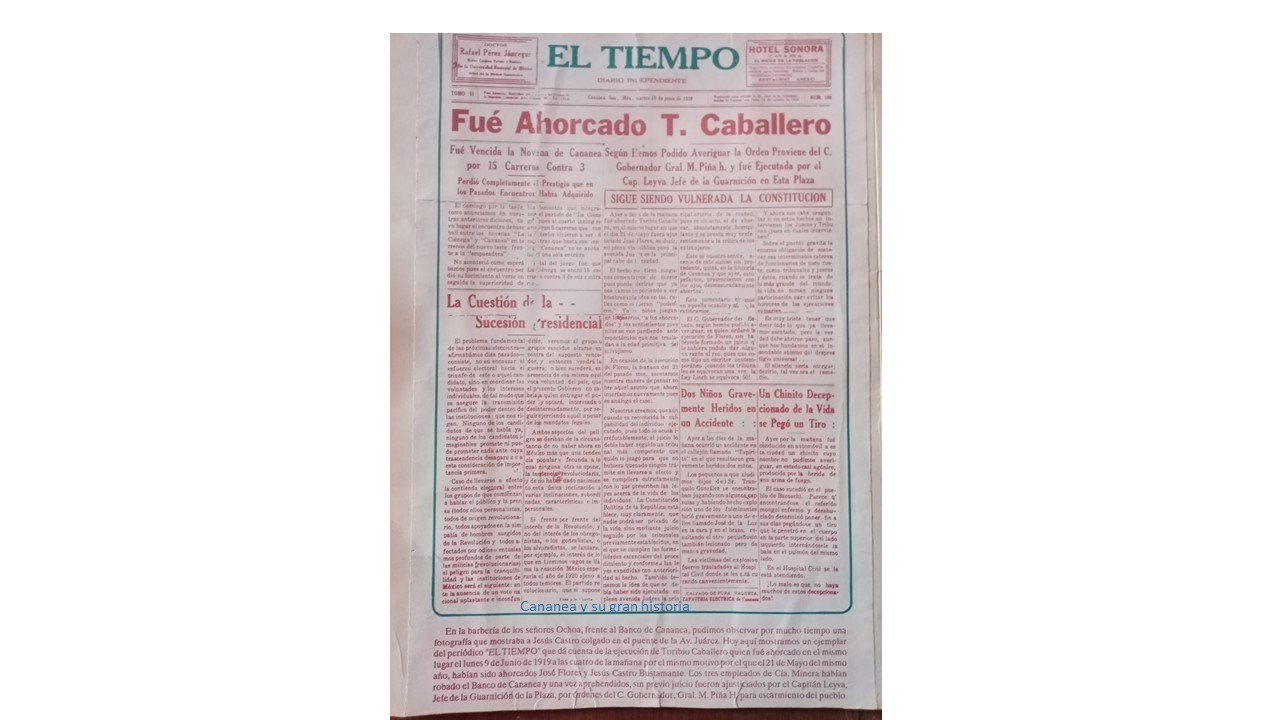 En la barbería de los señores Ochoa, frente al bando de Cananea, pudimos observar por mucho tiempo una fotografía que mostraba a Jesús Castro colgado en el puente de la Ave. Juárez. Hoy aquí mostramos un ejemplar del periódico “El Tiempo”, que da cuenta de la ejecución de Toribio Caballero quien fue ahorcado en el mismo lugar el lunes 9 de julio de 1919 a las 4 de la mañana por el mismo motivo por el 2l 21 de mayo del mismo año, habían sido ahorcados José Flores y Jesús Castro Bustamante.