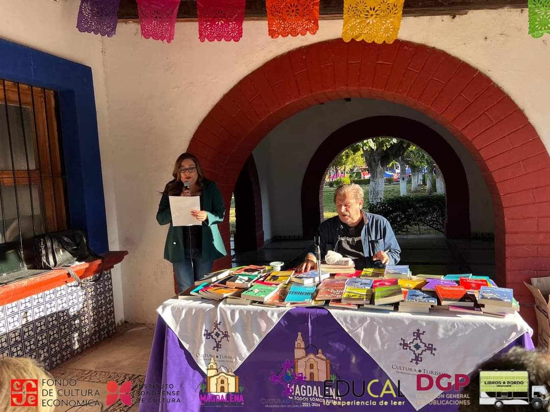 Al finalizar, el Director de FCE regaló libros a los presentes y acompañado de la Primera Dama, la maestra Estefanía Rojas Campoy; el Secretario del Ayuntamiento, Mario Rochin; la Regidora, Edilia Arvizu y la Cronista Municipal, Migde Pino, visitó el librobús de EDUCAL; El cual también pertenece a la estrategia que tiene el Fondo de Cultura para descentralizar los derechos del lector y promover la campaña que tiene como objetivo el poner a leer al país, sobre todo a los ejidos, los pueblos, las comunidades indígenas, las colonias populares, las escuelas rurales, los pueblos originarios, e incluso, a las tropas de las Fuerzas Armadas.