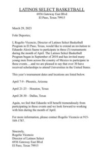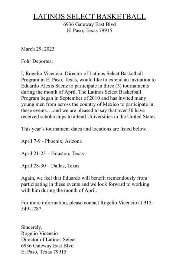 El basquetbolista cananense Alexis Sainz “El Shak” ha sido invitado al Programa Latinos Basketball del Paso Texas, para participar en tres torneos, cuyas sedes son Phoenix, Arizona, Houston Texas y Dallas Texas, del 7 al 30 de abril.
