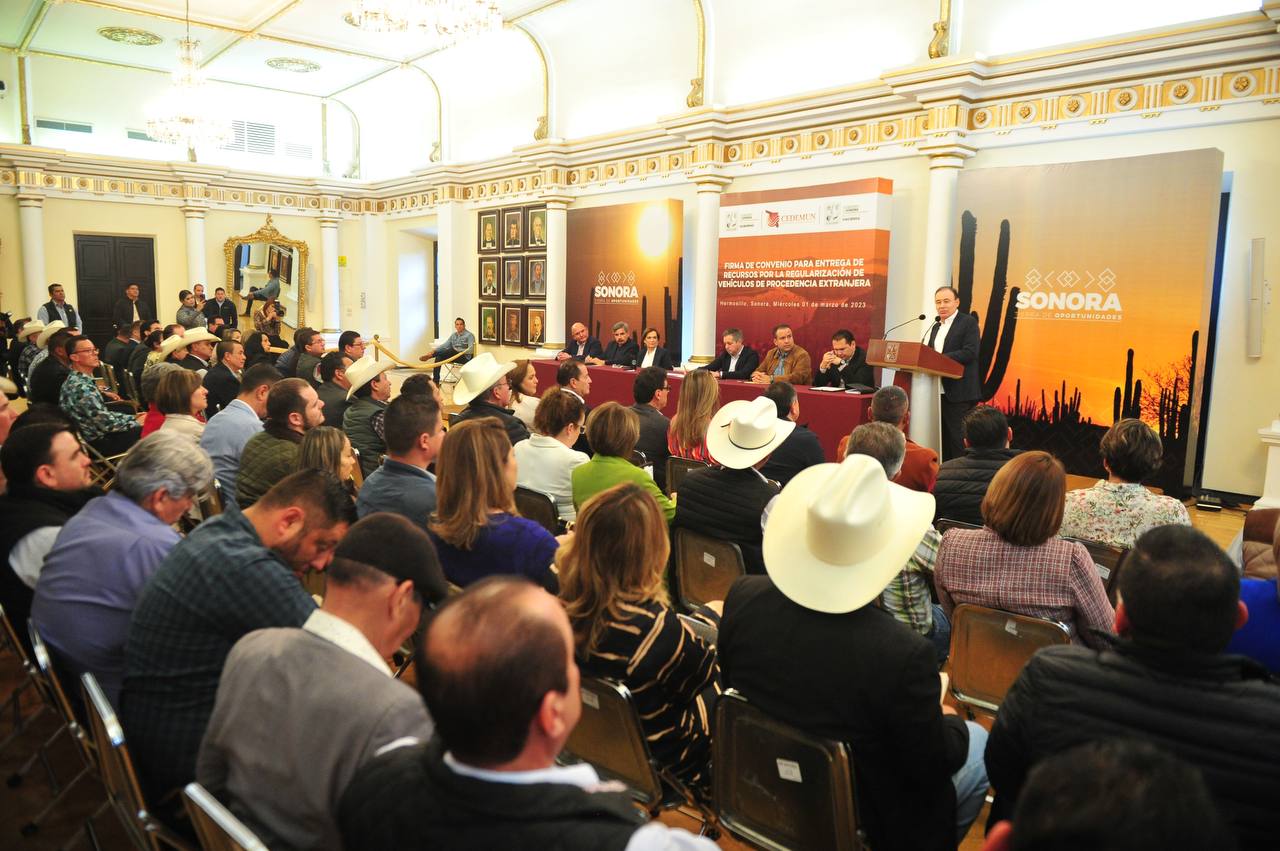 Hermosillo, Sonora; 1 de marzo de 2023.- El gobernador Alfonso Durazo Montaño firmó el convenio para la entrega de recursos procedentes del programa de regularización de autos de procedencia extranjera, monto que ronda los 114 millones de pesos para atención de 325 obras de pavimentación en más de 396 mil metros cuadrados de vialidades en la entidad.