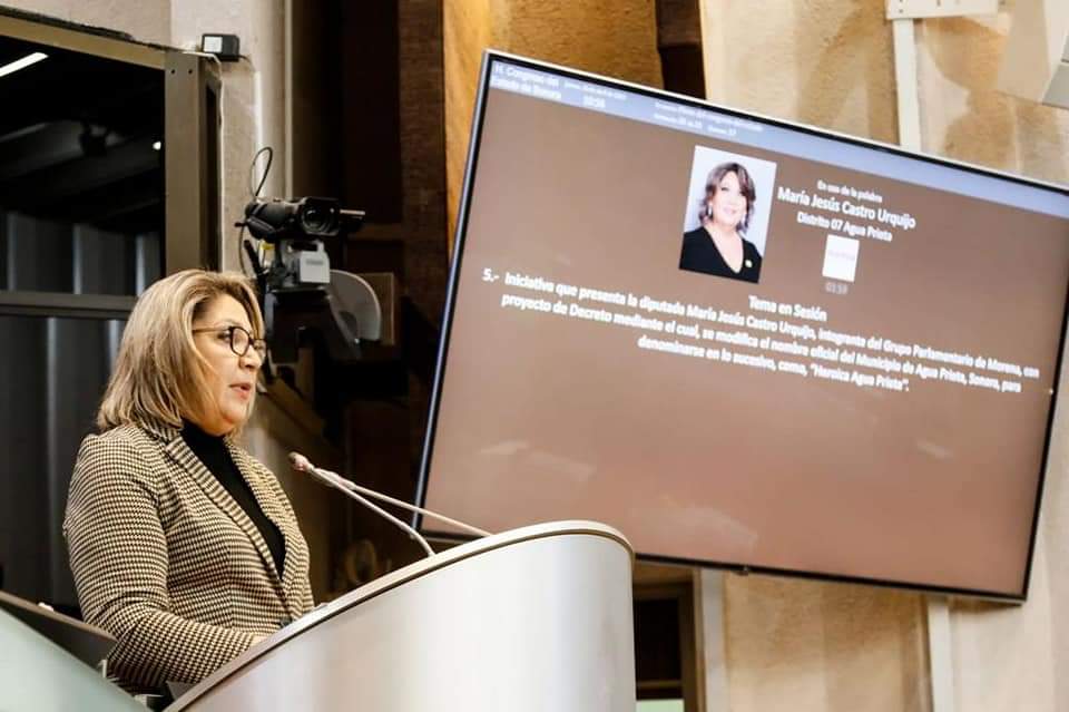 La diputada María Jesús Castro Arquito, integrante del grupo parlamentario de MORENA, presentó iniciativa con proyecto de Decreto mediante el cual se modifica el nombre oficial del municipio de Agua Prieta, Sonora, para denominarse, en lo sucesivo, como “Heroica Agua Prieta”, asunto que fue aprobado por mayoría del Pleno, una vez que se le dispensó la segunda lectura para que fuera considerado como de urgente y obvia resolución.