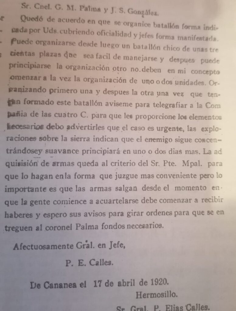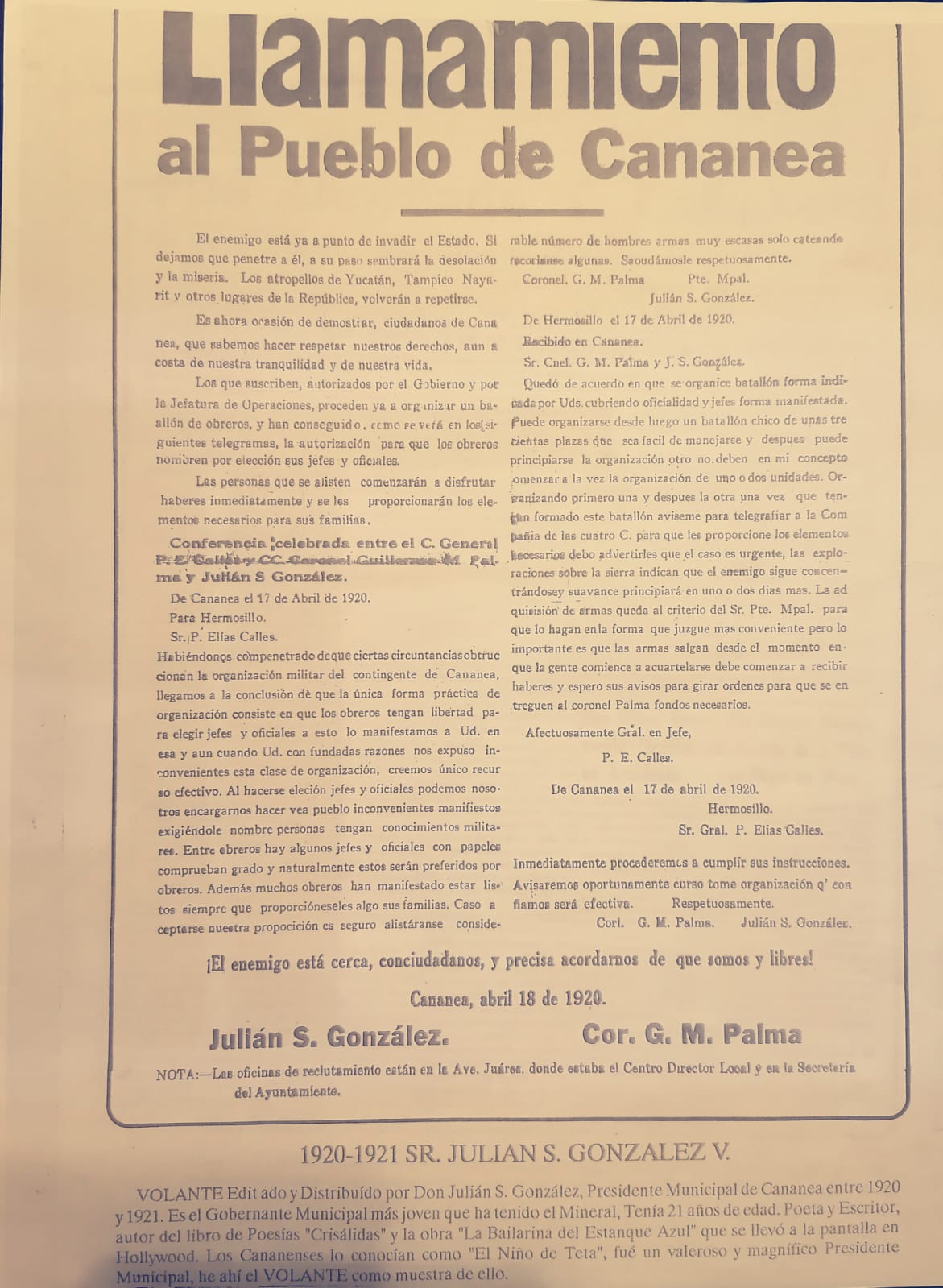 A continuación, un extracto del volante con fecha abril 18 de 1920, firmado editado y distribuido por el entonces presidente municipal Julián S. González y coronel G.M. Palma.