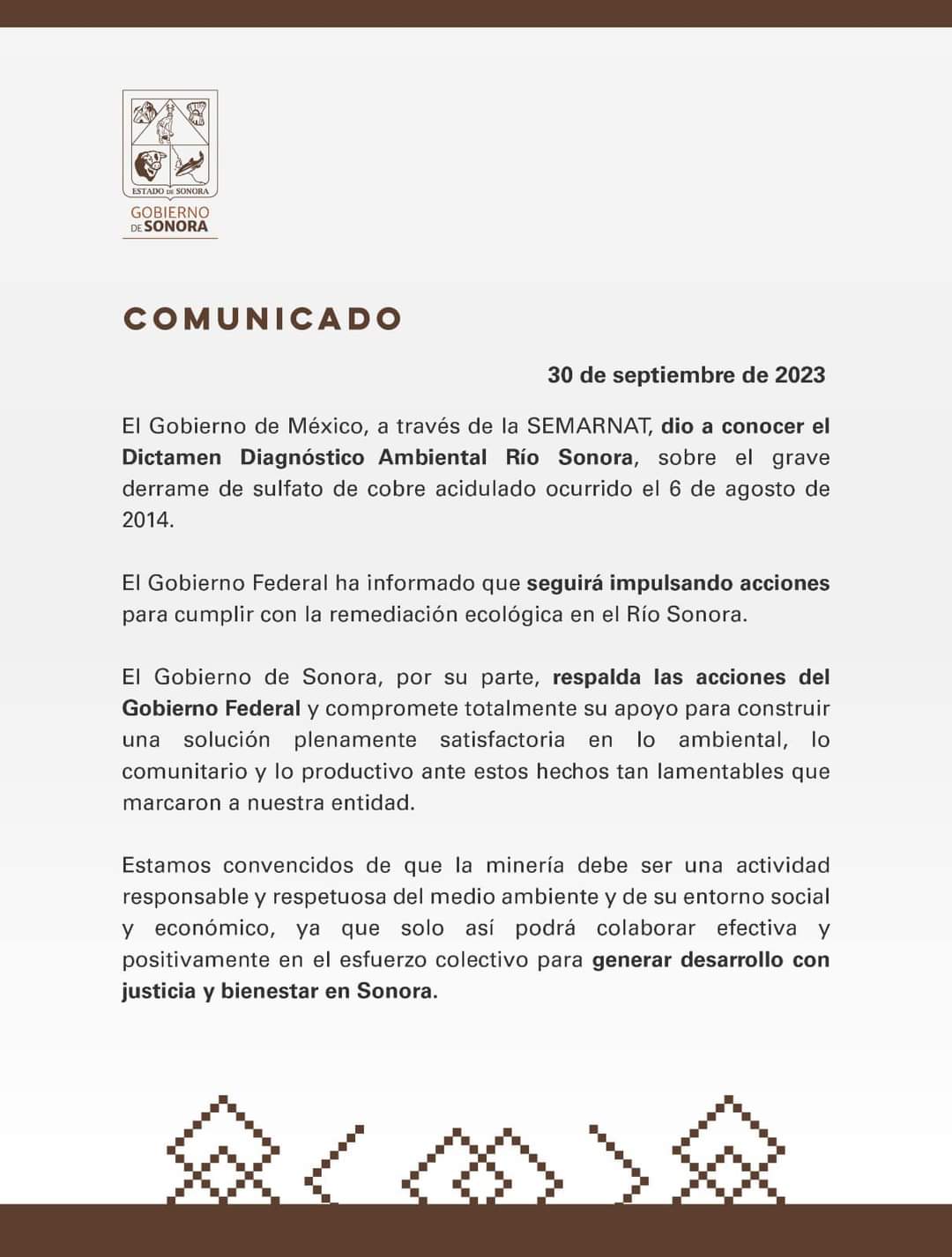 CDMX, a 01 de octubre de 2023.- La Secretaría de Medio Ambiente y Recursos Naturales presentó el Dictamen Diagnóstico Ambiental del Río Sonora, el cual revela que persiste la presencia de contaminación en agua, aire, flora y fauna, además de metales pesados por arriba de la norma a pesar de la remediación posterior al derrame de sulfato de cobre acidulado ocurrido el 6 de agosto de 2014.