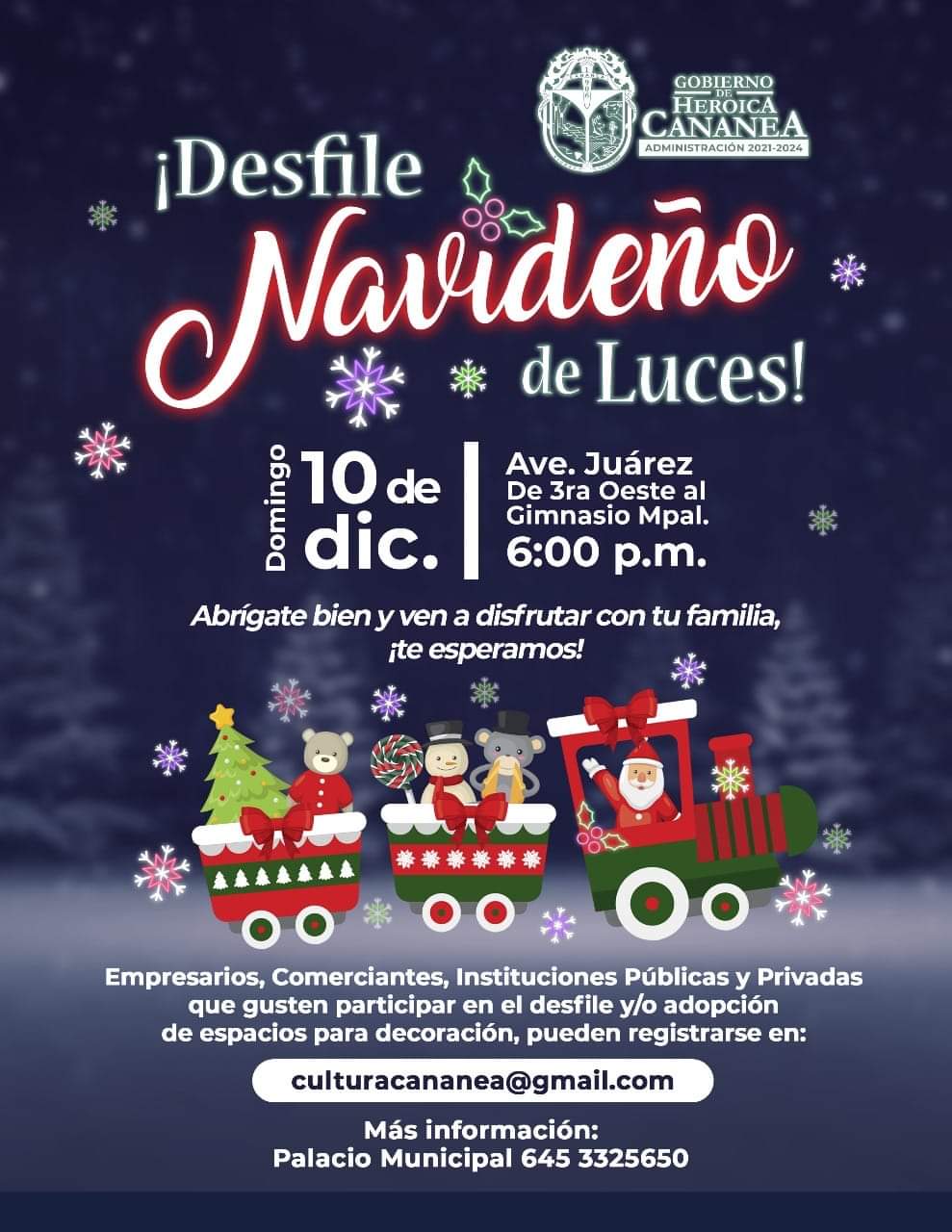 Cananea, Sonora a 22 de noviembre de 2023.- El Ayuntamiento se dijo listo para que autoridades, iniciativa privada y comunidad en general, participe en el próximo desfile de Navidad.