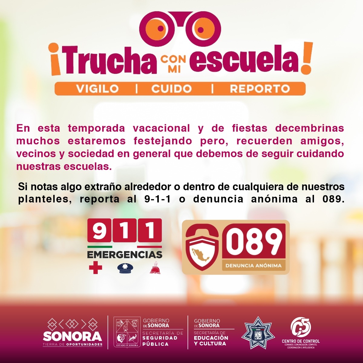 Hermosillo, Sonora, 18 de diciembre de 2023.- Con el inicio del período vacacional de diciembre, la Policía Estatal y C5I Sonora colaboran en el cuidado de planteles educativos a través del programa de la Secretaría de Educación y Cultura «Trucha con mi Escuela».