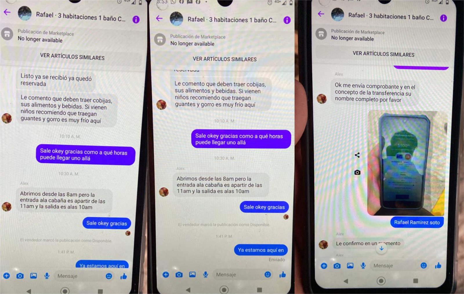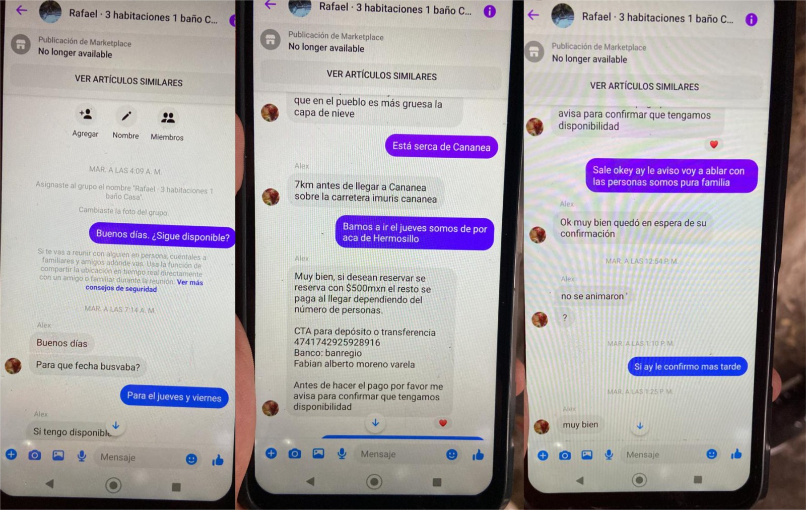 Denis Arvayo, administradora de Villa Alpina, relata que este jueves una familia llegó asegurando contar con reservaciones y comprobantes de pago que hicieron a nombre de Fabián Varela, quien publicó fotografías de las cabañas y las ofreció en renta en Facebook, el número telefónico desde el que estafó es el 662 325 71 38 y proporcionó el número de cuenta 4741 7429 2592 8916 de BANREGIO.