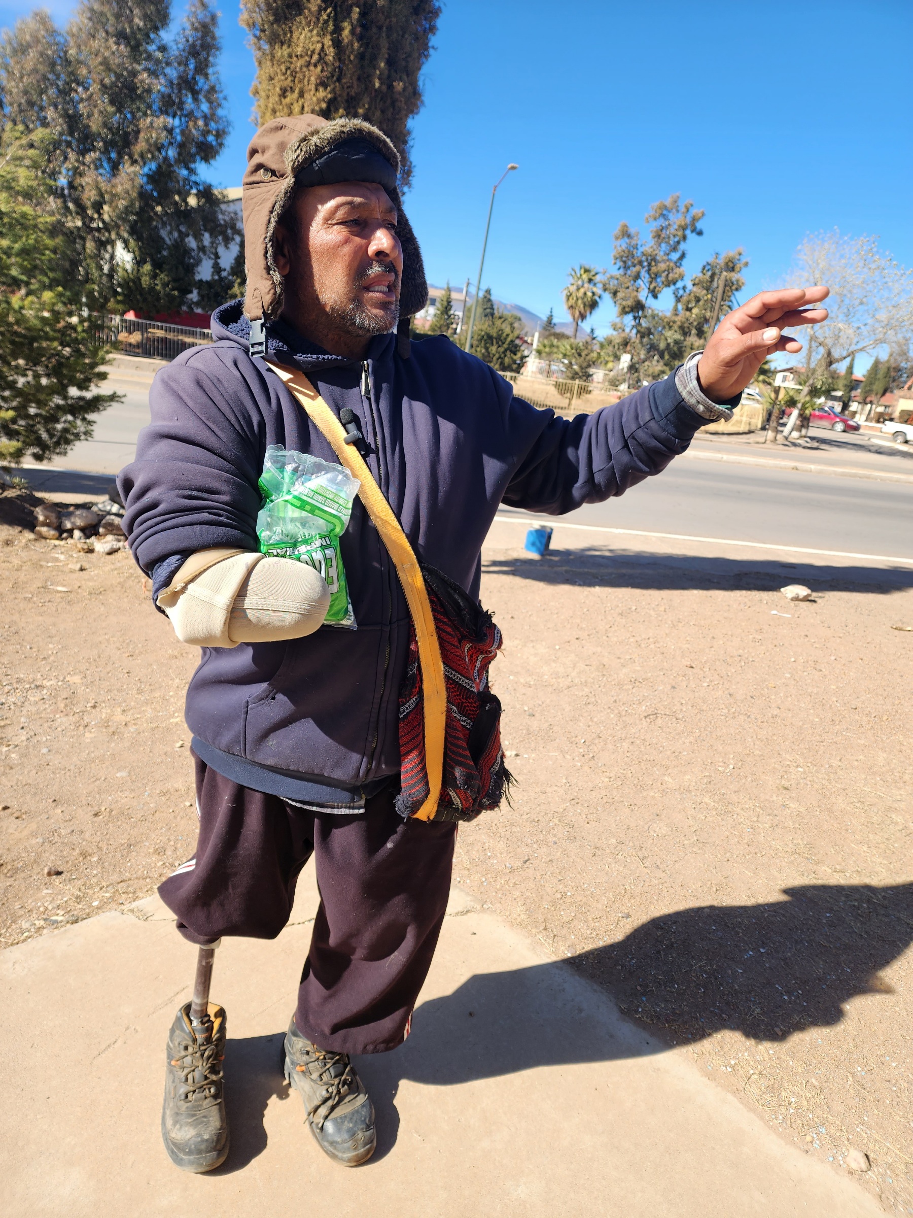 Cananea, Sonora, a 15 de enero de 2024.- El señor Noé Varela Rodríguez, originario de Durango, ha llegado de paso a Cananea como lo hace cada cierta temporada por algunos municipios de Sonora y de Baja California, con el fin de reunir recursos para su propio sustento y el de su familia, quienes le esperan en la ciudad de Ensenada.