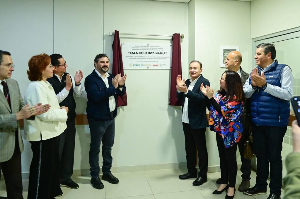 En el marco de esta agenda de trabajo, el gobernador Durazo Montaño develó la placa del segundo piso del Hospital General del Estado en el que se indica la transferencia de los servicios al sistema IMSS-Bienestar, ahí inauguró la sala de hemodinamia, donde se incorporó un aingiógrafo para diagnosticar y tratar diversas patologías, la cual se fortaleció con personal médico especialista en cardiología intervencionista y anestesiología, así como enfermería, técnicos radiólogos y personal auxiliar (camilleros).