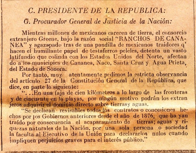 Previo a la entrega tuvo lugar una gran lucha en contra del Latifundio Greene, formulándose una denuncia el 5 de octubre de 1948 por la unificación de veteranos de la revolución, campesinos y gambusinos de Cananea, distinguiéndose por su activa participación el Prof. Ramón Oquita Montenegro, hasta su fallecimiento el cual ocurrió en el año de 1952, por fortuna para ese entonces ya se había unido al movimiento el Sr. Abel Ortiz, quien fuera cesado en su cargo como Jefe de la oficina federal de Hacienda, al parecer por influencia de los propietarios del Latifundio Greene, al haber proporcionado datos oficiales sobre la situación a la Procuraduría General de Justicia de la República.