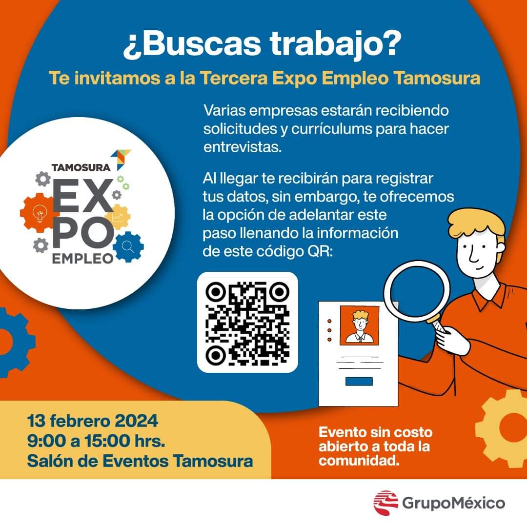 Cananea, Sonora, a 09 de febrero de 2024.- Después de implementarse en 2022 y ante el gran éxito y buena respuesta registrada, regresa la tercera edición de Expo Empleo Tamosura, un espacio en el que empresas dan a conocer sus vacantes y reciben solicitudes para hacer entrevistas.