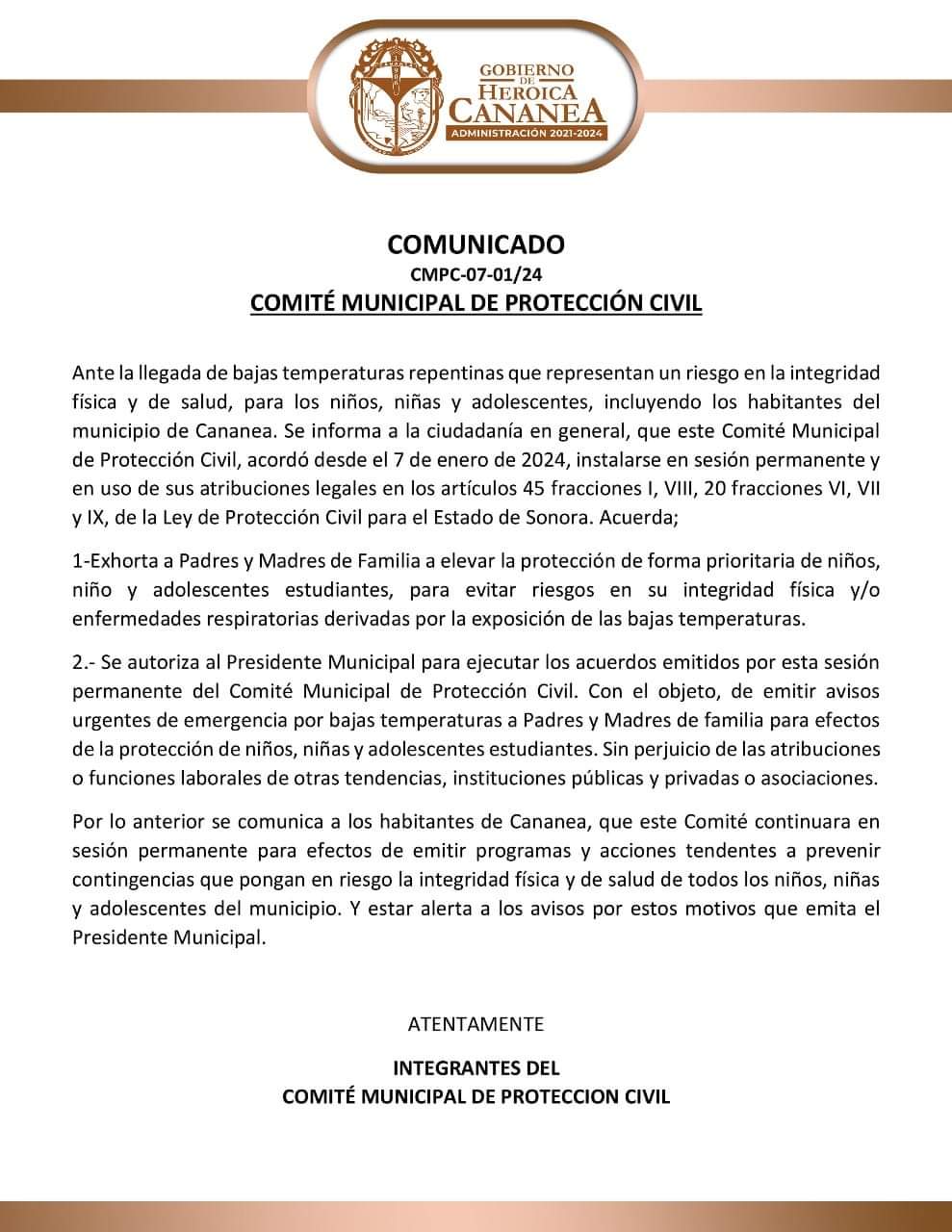 En uso de sus atribuciones legales que derivan del artículo 45 fracciones I, VII, así como el artículo 20 fracciones IV, VII y IX, de la Ley de Protección Civil para el Estado de Sonora, dicho organismo acuerda exhortar a padres y madres de familia a elevar la protección de forma prioritaria de sus hijos estudiantes, para evitar riesgos en su integridad física y enfermedades respiratorias derivadas por la exposición a las bajas temperaturas.