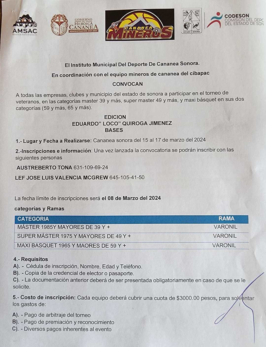 En este torneo de Veteranos de Básquetbol será homenajeado Eduardo Quiroga Jiménez, quién ha sido un incansable promotor de este deporte en nuestra ciudad.