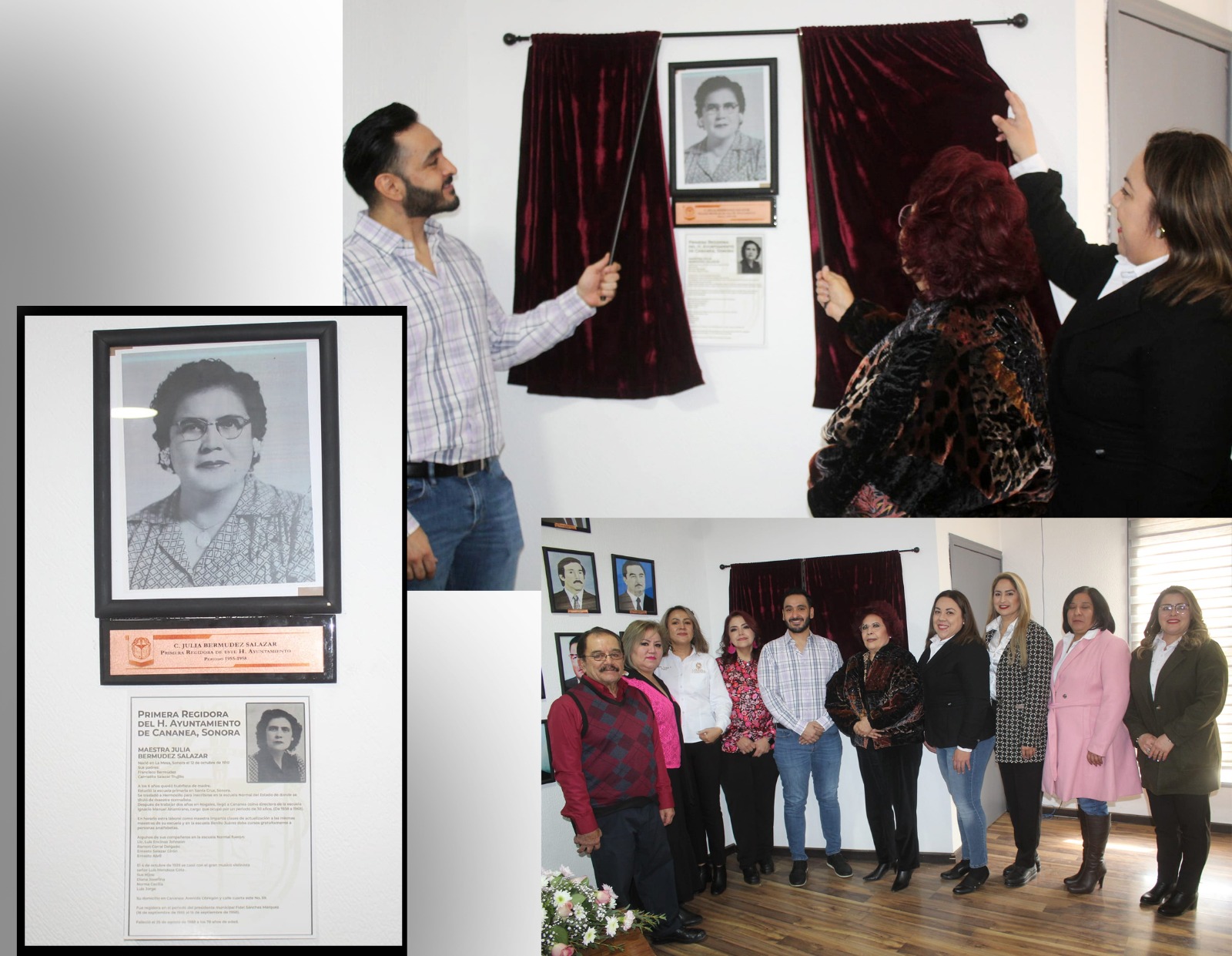 Cananea, Sonora, a 09 de marzo de 2024.- En el Día Internacional de la Mujer se honró el legado de Julia Bermúdez Salazar, la primera Regidora del H. Ayuntamiento de Cananea durante el período 1955-1958, develaron una placa, fotografía y una breve reseña bibliográfica en reconocimiento de su invaluable contribución a la comunidad.