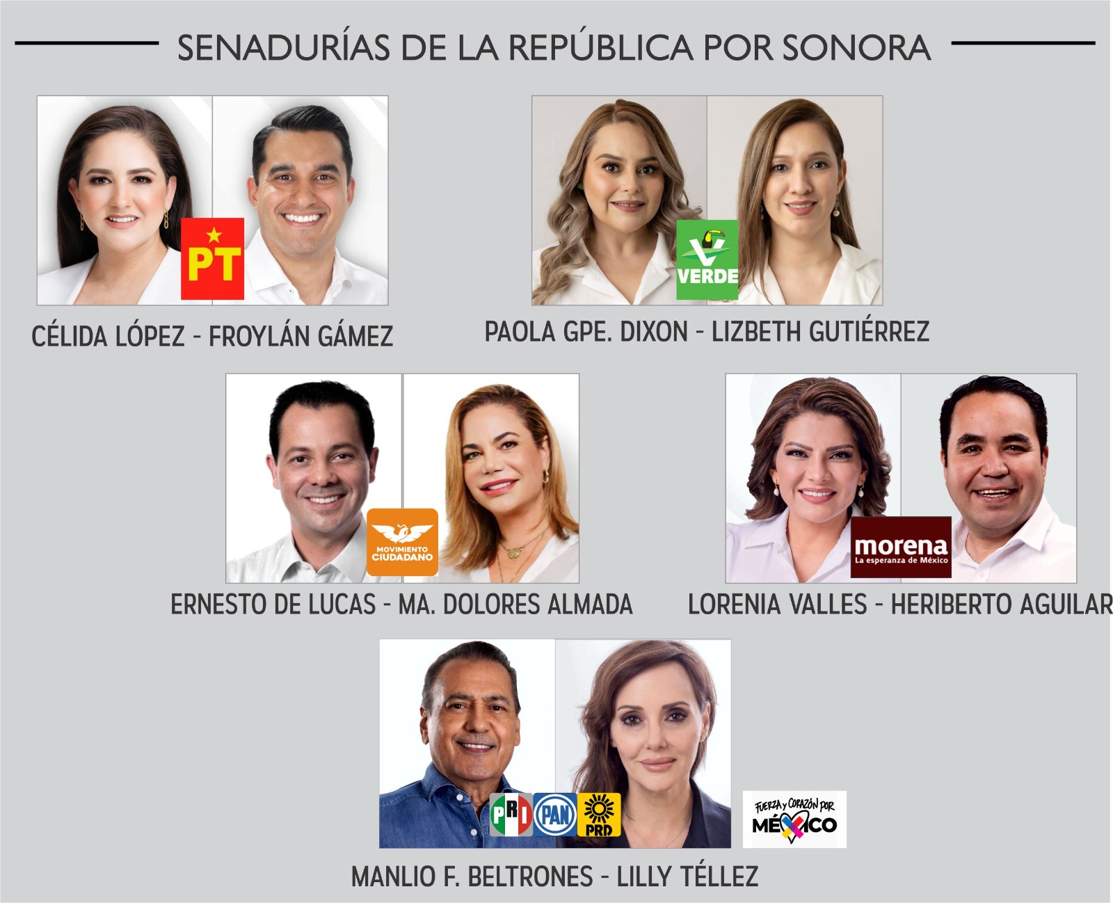 Para Senadurías de la República por Sonora buscan un puesto las siguientes fórmulas de candidatos y candidatas: Célida Teresa López Cárdenas y Froylán Gámez Gamboa, por el PT; Paola Guadalupe Dixon Chaira y Lizbeth Gutiérrez Obeso, por el PVEM; Ernesto de Lucas Hopkins y María Dolores Rosas Almada, por Movimiento Ciudadano; Lorenia Iveth Valles Sampedro y Heriberto Marcelo Aguilar Castillo, por MORENA; Manlio Fabio Beltrones Rivera y María Lilly del Carmen Téllez García, por el PRI, PAN y PRD.