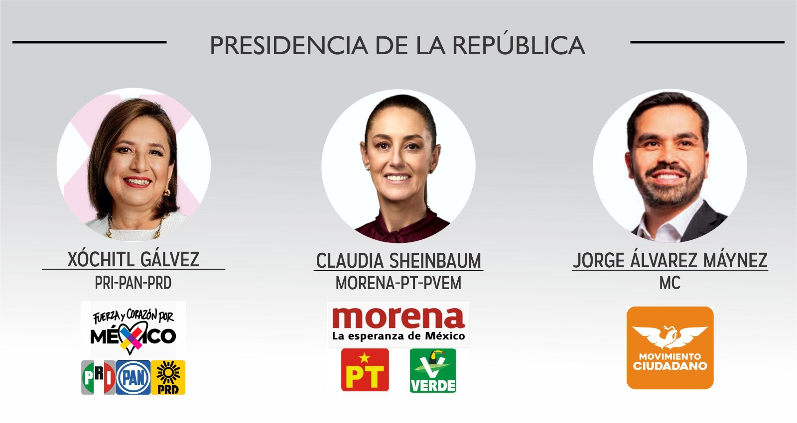 Mientras que en el país la elección de mayor relevancia es la Presidencia de la República, las candidatas y el candidato son; Bertha Xóchitl Gálvez Ruiz, por la coalición Fuerza y Corazón por México, Claudia Sheinbaum Pardo, por la coalición Sigamos Haciendo Historia; y Jorge Álvarez Máynez, por Movimiento Ciudadano.