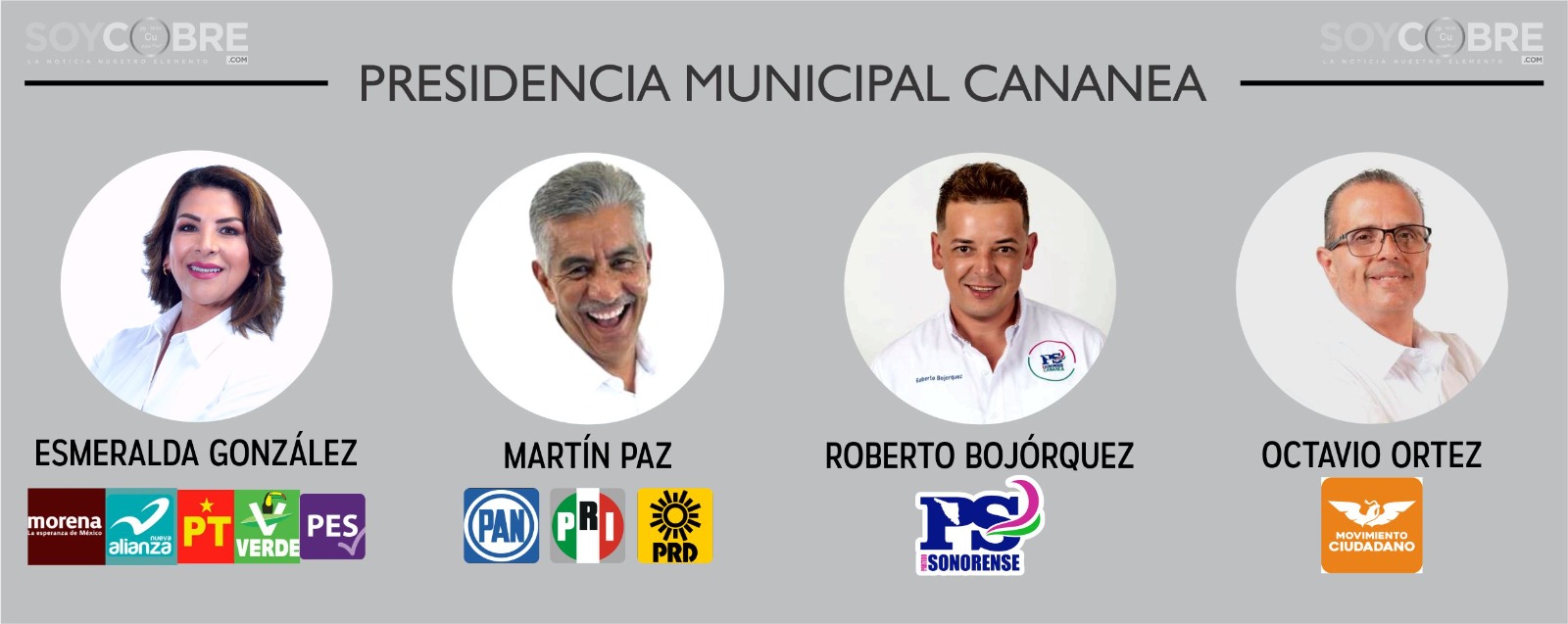 En Cananea los candidatos a la presidencia municipal son: Carmen Esmeralda González Tapia, por los partidos MORENA, PANAL, PT, PES y PVEM; Martín Adrián Paz Bustamante, por la coalición PAN, PRI y PRD; José Roberto Bojórquez Delgadillo, por el Partido Sonorense; y Reyes Octavio Ortez Muso, por el partido Movimiento Ciudadano.