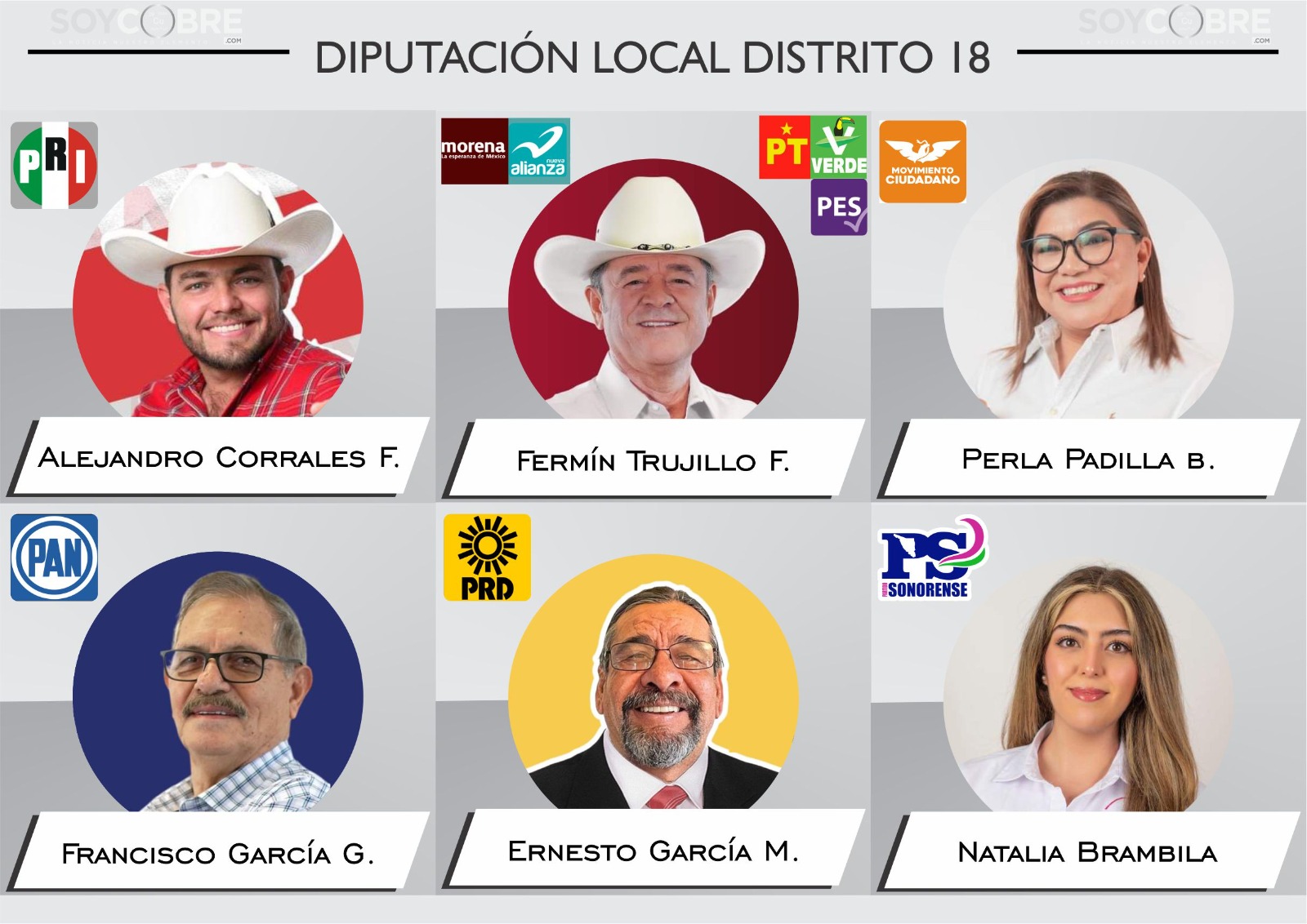 Los candidatos y candidatas a la diputación local para representar el Distrito 18 con cabecera en Cananea son los siguientes; Alejandro Corrales Félix, por el PRI; Fermín Trujillo Fuentes, por los partidos MORENA, PANAL, PT, PES y PVEM; Perla Padilla Bonillas, por el partido Movimiento Ciudadano; Francisco García Gámez, por el PAN; Ernesto García Moreno, por el PRD; y Lizbeth Natalia Brambila Padilla, por el Partido Sonorense.