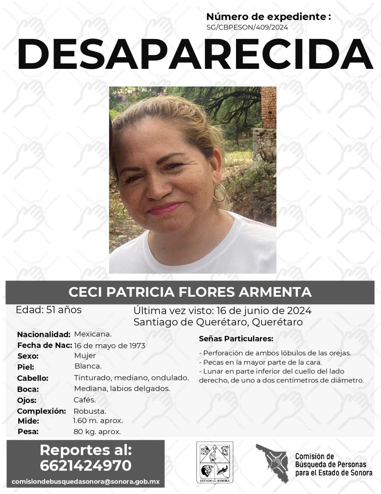 Hermosillo, Sonora, a 17 de junio de 2024.- La Comisión de Búsqueda de Personas para el Estado de Sonora lleva actualmente coordinación con la Comisión Nacional de Búsqueda, así como con sus homólogos en Querétaro y Ciudad de México para lograr la ubicación y contacto de Ceci Patricia Flores Armenta, líder del colectivo Madres Buscadoras de Sonora.