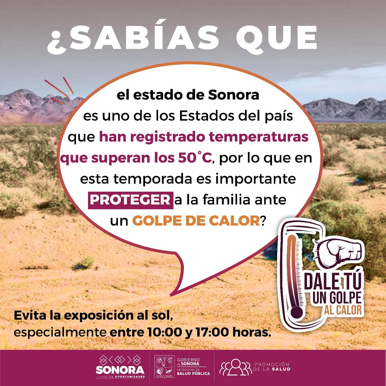 Hermosillo, Sonora; 11 de junio de 2024.- La exposición extrema al calor puede provocar consecuencias negativas al organismo, desde casos leves de sarpullido, hasta casos graves y mortales de deshidratación y golpe de calor; por ello la Secretaría de Salud (SSA) exhortó a la población a cuidarse y tomar precauciones.