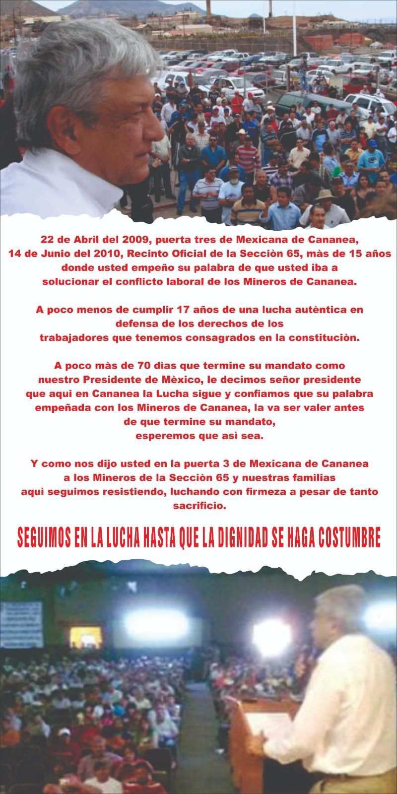 Hacen un llamado lleno de esperanza, pero también con desesperación; “Lic. Andrés Manuel López Obrador, Presidente Constitucional de los Estados Unidos Mexicanos, los 657 compañeros y las familias que integramos la H. Sección 65 le preguntamos que si aún sigue firme su palabra que empeñó con los trabajadores antes y siendo presidente de la República, de resolver el conflicto de huelga que estamos por cumplir 17 años este próximo 30 de julio”.
