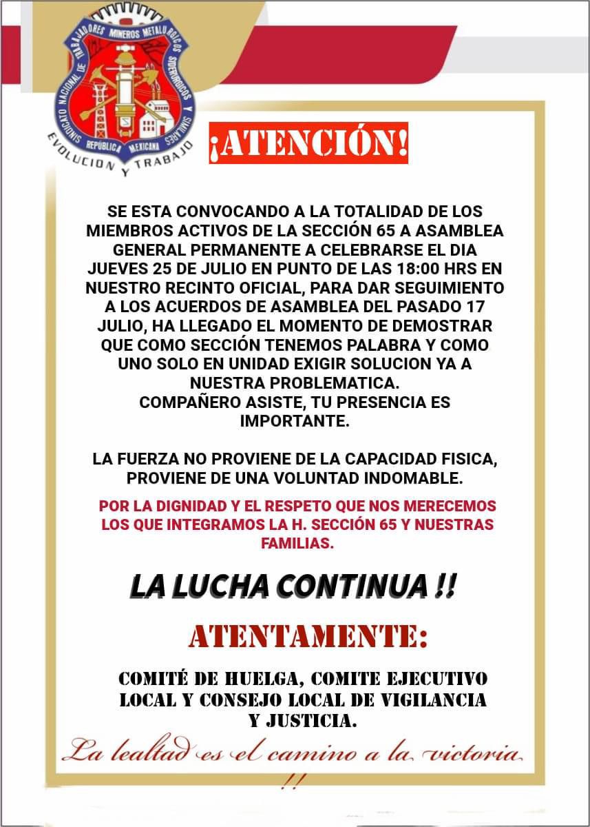 Es por ello que, en conformidad con los acuerdos tomados en la pasada asamblea, los mineros de la Sección 65 convocan a todos los miembros activos este jueves 25 de julio a una asamblea general permanente a celebrarse a las 6:00 de la tarde en el recinto oficial, con el fin de demostrar que como sección tienen palabra, y en unidad exigir una solución a su problemática.