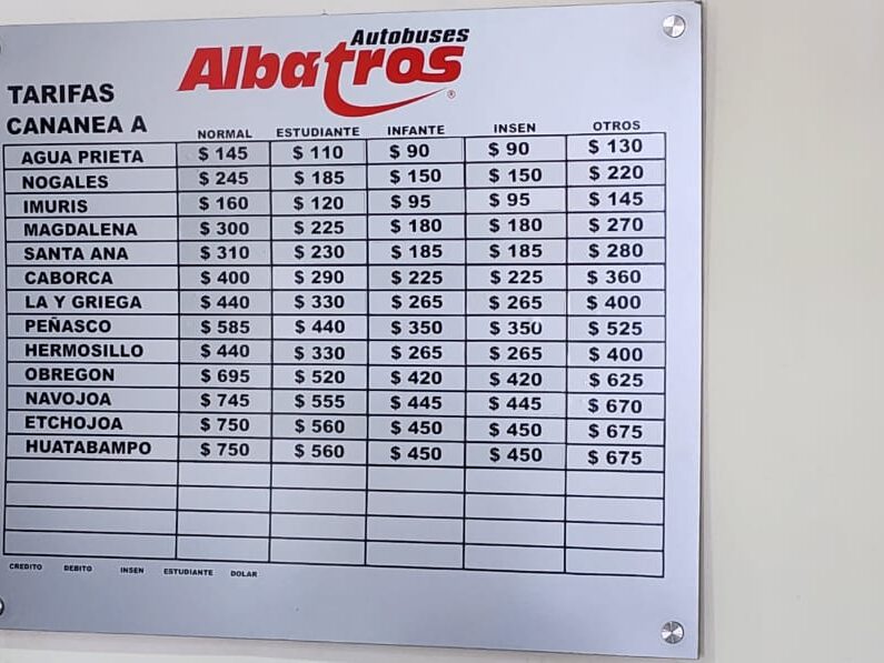 Con 21 años de experiencia, Albatros Autobuses amplió sus destinos dentro del territorio sonorense, la sucursal Cananea ofrece el traslado a las ciudades de Agua Prieta, Nogales, Ímuris, Magdalena, Santa Ana, Caborca, La Y Griega, Puerto Peñasco, Hermosillo, Obregón, Navojoa, Etchojoa y Huatabampo, con tarifa normal, y descuentos sin limitaciones en número de pasajeros estudiantes, adultos mayores y otras necesidades especiales.