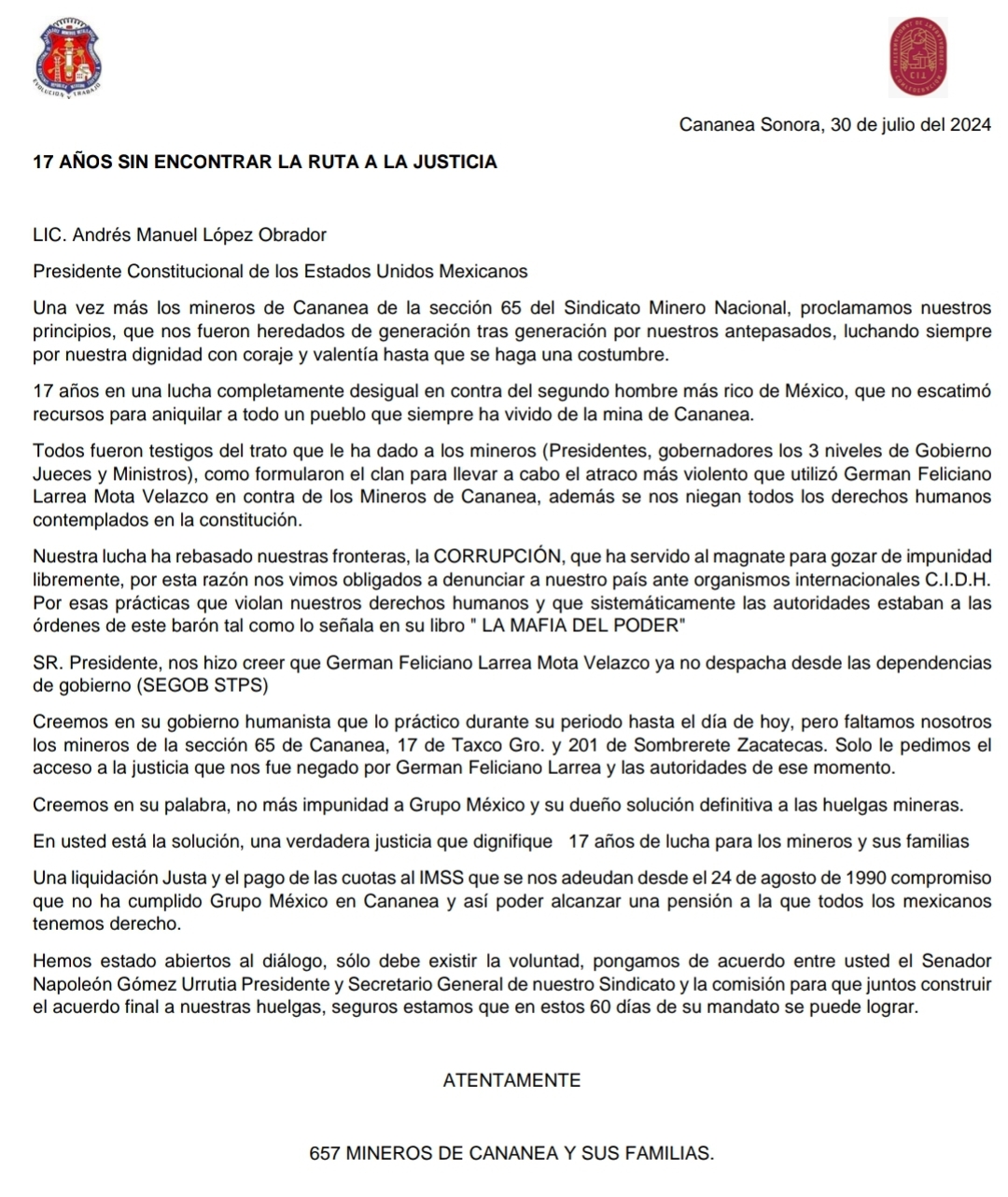 “Todos fueron testigos del trato que le ha dado a los mineros (presidentes, gobernadores los 3 niveles de gobierno, jueces y ministros), como formularon el clan para llevar a cabo el atraco más violento que utilizó Germán Feliciano Larrea Mota Velazco en contra de los Mineros de Cananea, además se nos niegan todos los derechos humanos contemplados en la constitución”.