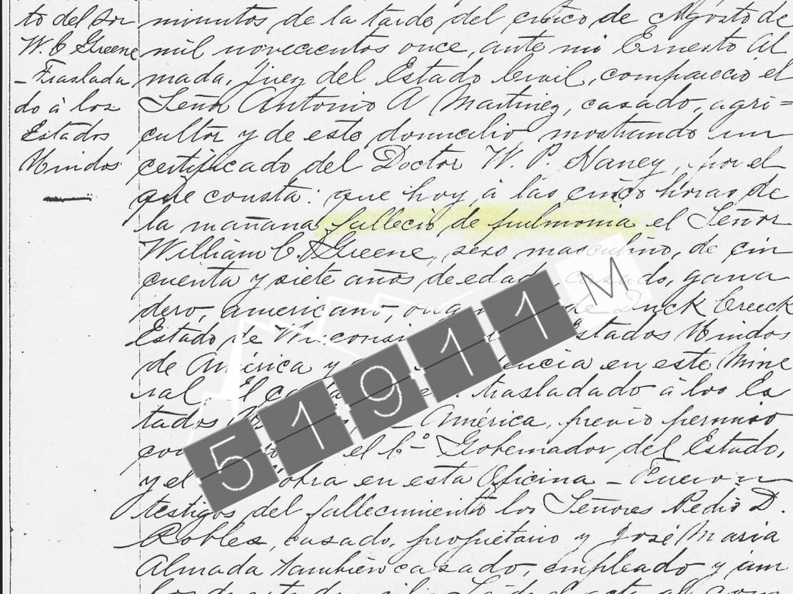 El acta No. 264 indica que en la ciudad de Cananea a las 4 horas con 35 minutos de la tarde del día 05 de 1911, comparece el señor Antonio A. Martínez, presentando un certificado del Dr. W. P. Haney, dando constancia del fallecimiento del William C. Greene, siendo la causa pulmonía, edad 57 años. La misma acta refiere que el Sr. Greene es originario de Duck Creek estado de Wisconsin de los Estados Unidos, con residencia en este mineral. El cadáver será trasladado a los Estados Unidos de américa, previo permiso concedido por el C. Gobernador del Estado. Fueron testigos del fallecimiento los señores Pedro D. Robles y José María Almada.