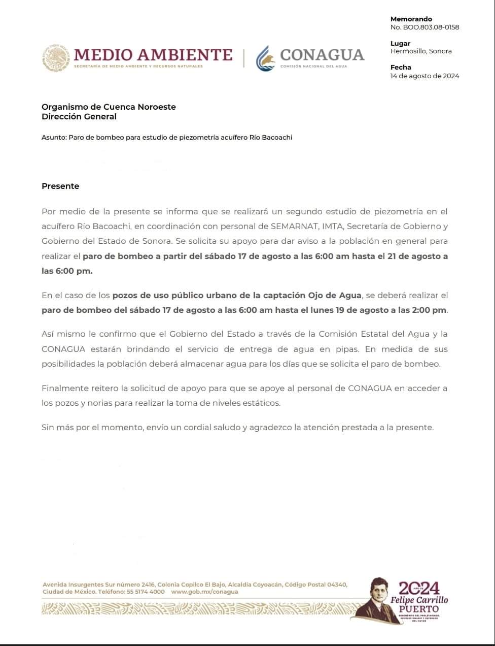 Cananea, Sonora, a 15 de agosto de 2024.- La Comisión Estatal del Agua unidad Cananea informa que ante la solicitud de parte de la CONAGUA para la realización de estudios en el acuífero de la cuenca Bacoachi, que abarca el área de pozos del Ojo de Agua, se realizará un paro de dicho sistema el sábado 17 de agosto a partir de las 6:00 de la mañana, hasta el día lunes 19 de agosto a las 2:00 de la tarde.