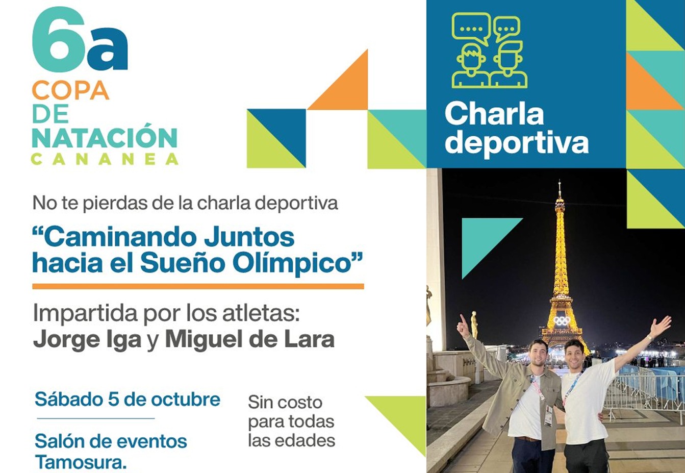 Cananea, Sonora, a 04 de octubre de 2024.- Cananea está de manteles largos al recibir a los nadadores olímpicos Jorge Iga y Miguel de Lara, quienes impartirán una charla emocionante y motivadora “Caminando Juntos Hacia el Sueño Olímpico”, dirigida al público en general y sin costo este sábado 5 de octubre a las 6:00 de la tarde en el salón de eventos del Parque Tamosura, dentro de los eventos de la 6ta Copa de Natación de Grupo México.