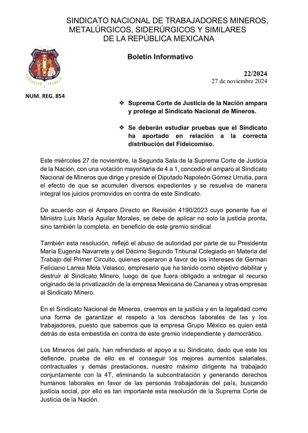 Entre tanto, el Sindicato Minero Nacional, emitió un comunicado donde especifica que la Suprema Corte de Justicia de la Nación ampara y protege al Sindicato Nacional de Mineros y se deberá estudiar pruebas que el sindicato ha aportado en relación a la correcta distribución del fideicomiso.