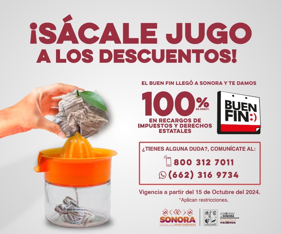 El maestro Jorge Iván de la Rosa, subsecretario de ingresos de la Secretaría de Hacienda del Estado de Sonora, mencionó que estos descuentos se implementaron a través del programa denominado ¡Sácale jugo a los descuentos!, al sumarse a la campaña nacional del Buen Fin, pero con mayor extensión, pues los descuentos tiene vigencia del 15 de octubre al 31 de diciembre.