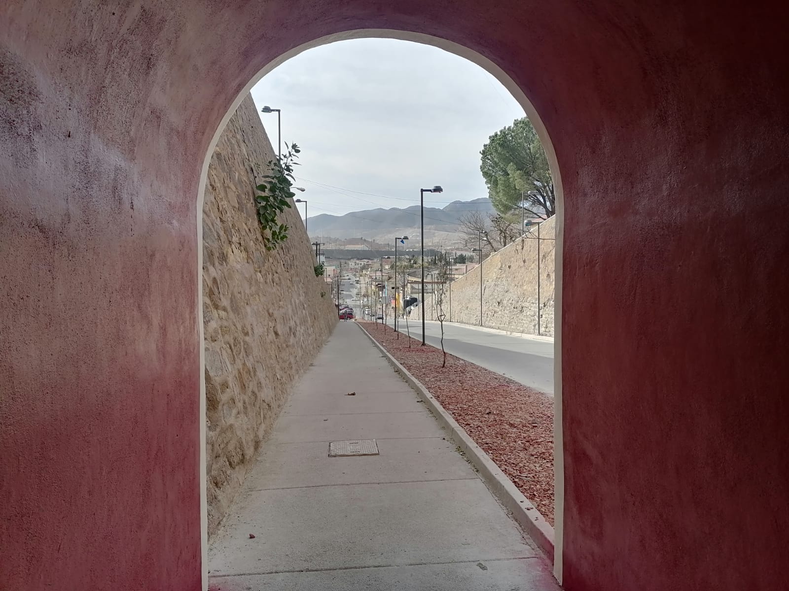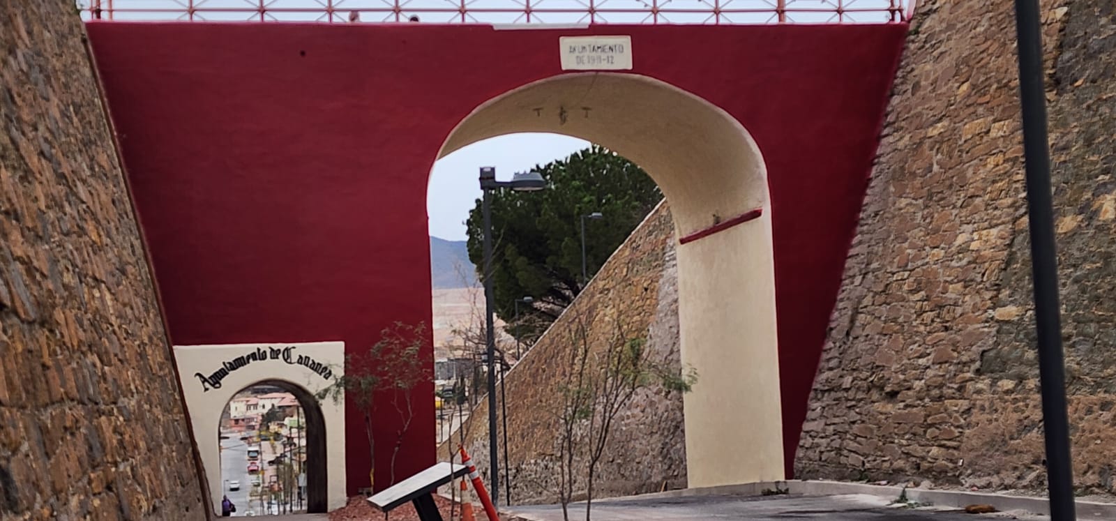 Cananea, Sonora a 02 de enero de 2025.- El puente de Arco de la avenida principal en Cananea, Sonora, luce reciente remodelación luego del oportuno arreglo a la parte superior del histórico arco, construido en 1911 – 1912, y de igual manera el exterior e interior del arco peatonal 1933 – 1935.