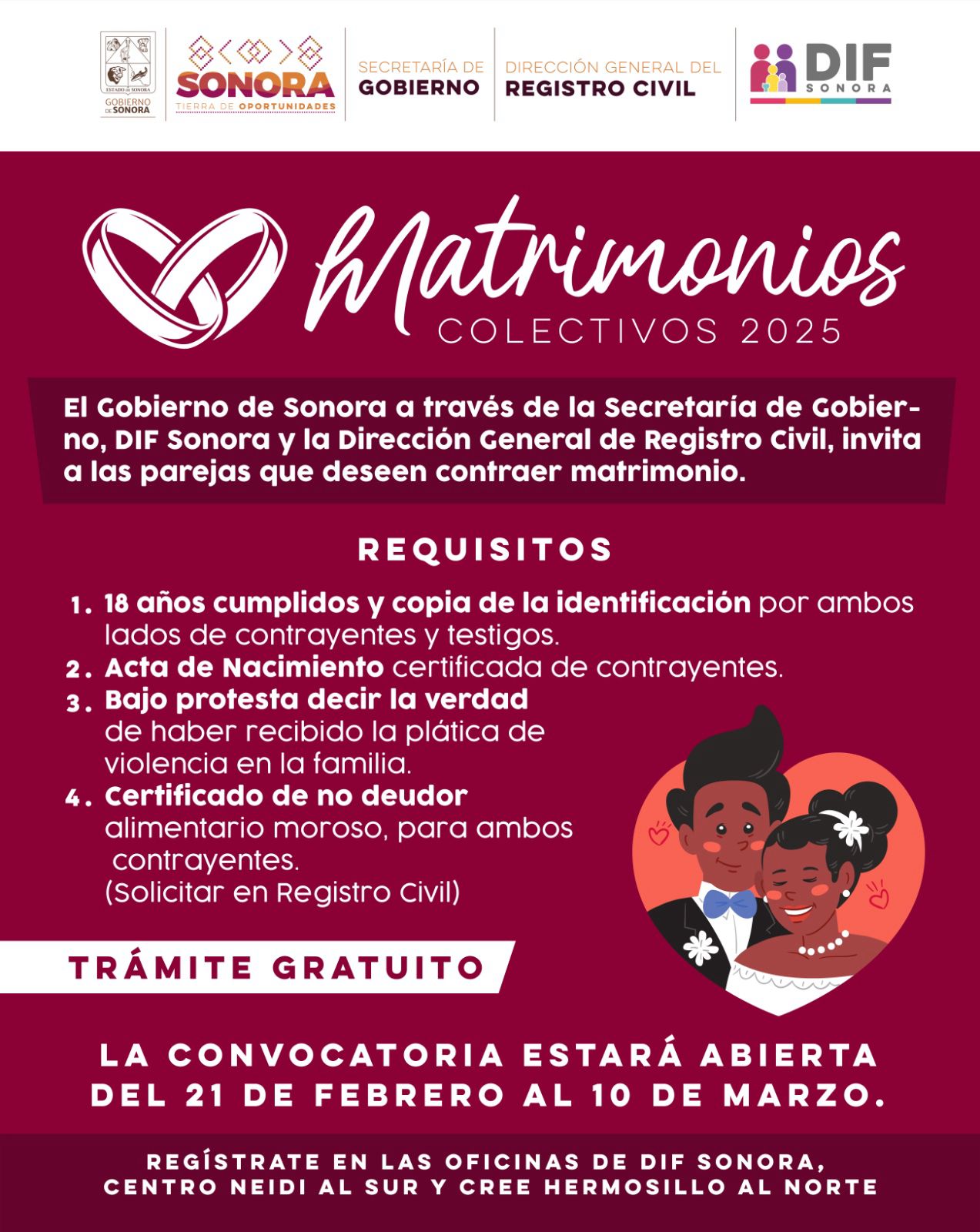 Las parejas interesadas pueden acercarse a los sistemas DIF de sus respectivos municipios para llevar la documentación del 21 de febrero al 10 de marzo y en el caso de Hermosillo los registros se realizarán en las oficinas de DIF Sonora, CREE y Centro Néidi para abarcar las zonas centro, norte y sur de la Capital.