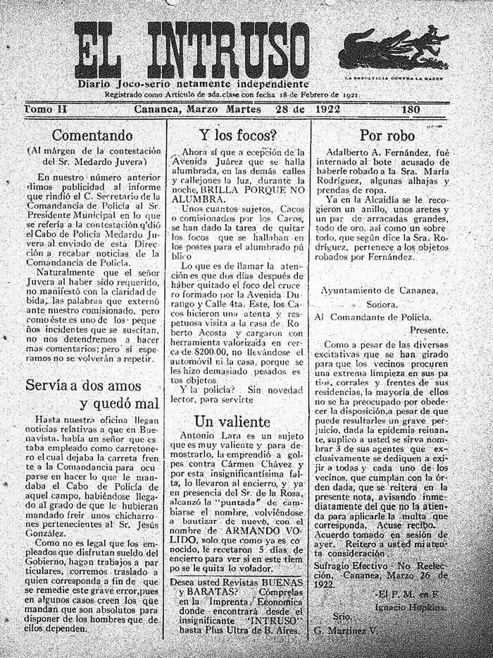 Un día 28 de marzo pero del año 1922 (103 años) en su edición 180 Tomo II, Diario El Intruso, publicaba lo siguiente: