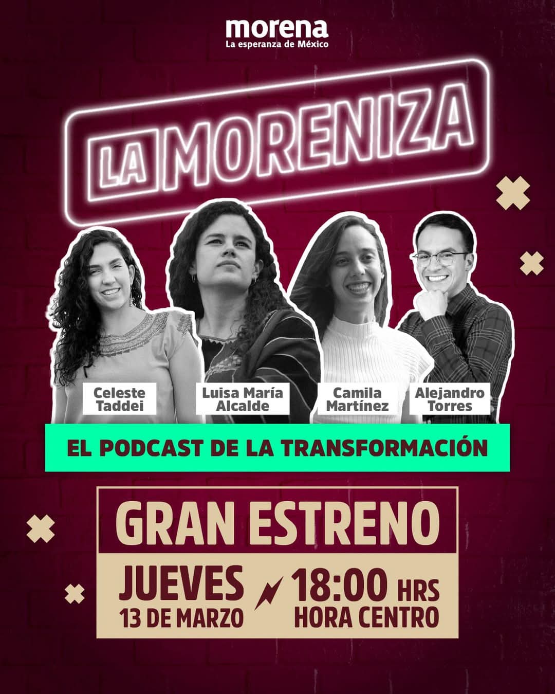 Ciudad de México, a 12 de Marzo de 2025.- El próximo jueves 13 de marzo, a las 18:00 horas (centro), Morena estrenará La Moreniza, el podcast de la Transformación, espacio que servirá para conectar con la militancia y el cual será conducido por la Presidenta Nacional de Morena, Luisa María Alcalde Luján, así como por militantes, integrantes del Comité Ejecutivo Nacional (CEN) y figuras centrales del Movimiento.