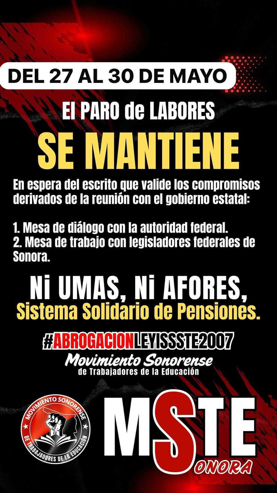 Cananea, Sonora, a 26 de mayo de 2025.- Debido a que no hay respuesta favorable del gobierno federal a las solicitudes del magisterio, este gremio a nivel nacional y estatal tomó acuerdos durante este fin de semana, por lo que este martes 27 de mayo los maestros de escuelas federalizadas de Cananea junto a otros municipios de Sonora comienzan un paro de labores, en busca de ser atendidos en sus demandas por la abrogación de la Ley ISSSTE del 2007.