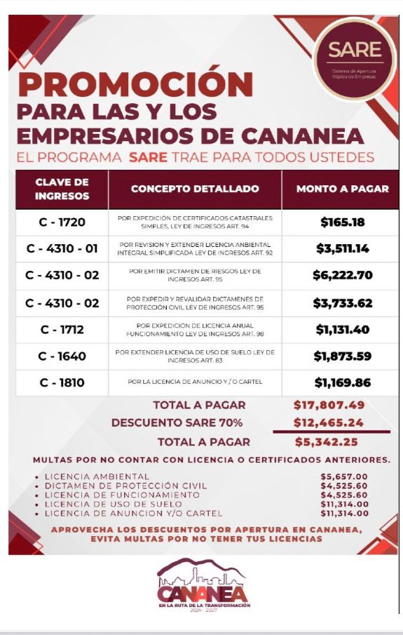 Canchola Félix, señaló que una mala comunicación del Ayuntamiento dio pie a la confusión y controversia sobre este tema, e hizo saber que en esta reunión se aclararon varios puntos, por ejemplo, no todos los comerciantes deberán tramitar las licencias y permisos que establece la ley, para algunos aplica y para otros no, según su actividad comercial, no todas se pagan de nuevo en 2026, pues hay ciertos permisos que se tramitan por única vez, por lo que no se trata de un monto general, no obstante que en el aviso y promoción que hizo el Gobierno Municipal en su momento, nunca se explicaron estos puntos solo se sumaban las licencias a expedir acumulando un monto de $17,807.49, pero con descuento del Programa SARE, de un 70%, la cantidad general disminuía a $5,342.25. Incluyendo de no realizarse el pago, multas varias de hasta $11,314.00.