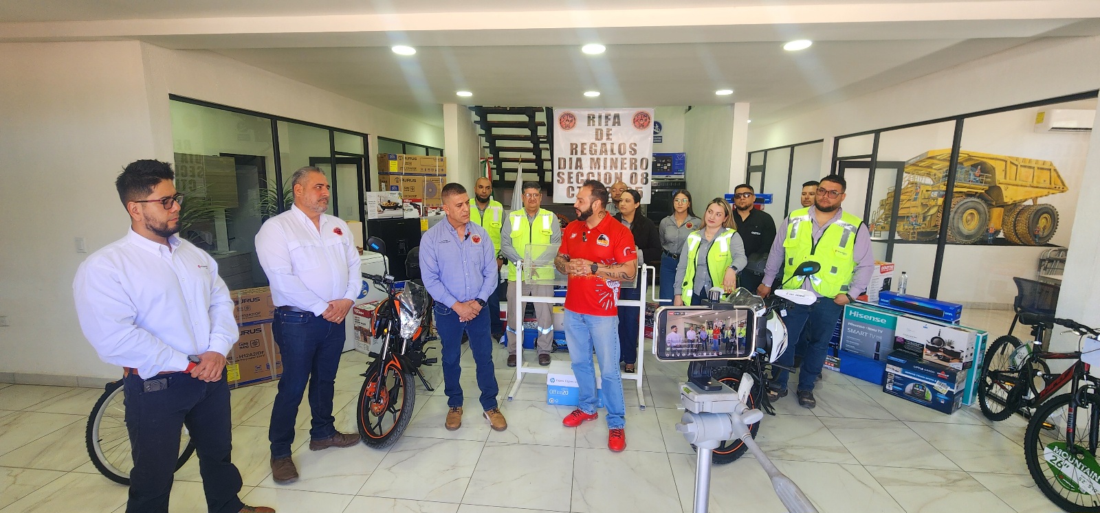 Tras reunir y organizar los diferentes regalos, el comité ejecutivo local que encabeza Martín Díaz Borboa, en coordinación con Grupo México efectuó la rifa de regalos por medio de tómbola para sacar los nombres de los afortunados trabajadores de todas las áreas de la mina que resultaron ganadores de diferentes premios, desde televisores, bocinas, cafeteras, asadores, cajas de herramientas, microondas, hasta lavadoras, estufas, minisplits, una motocicleta y una cuatrimoto.