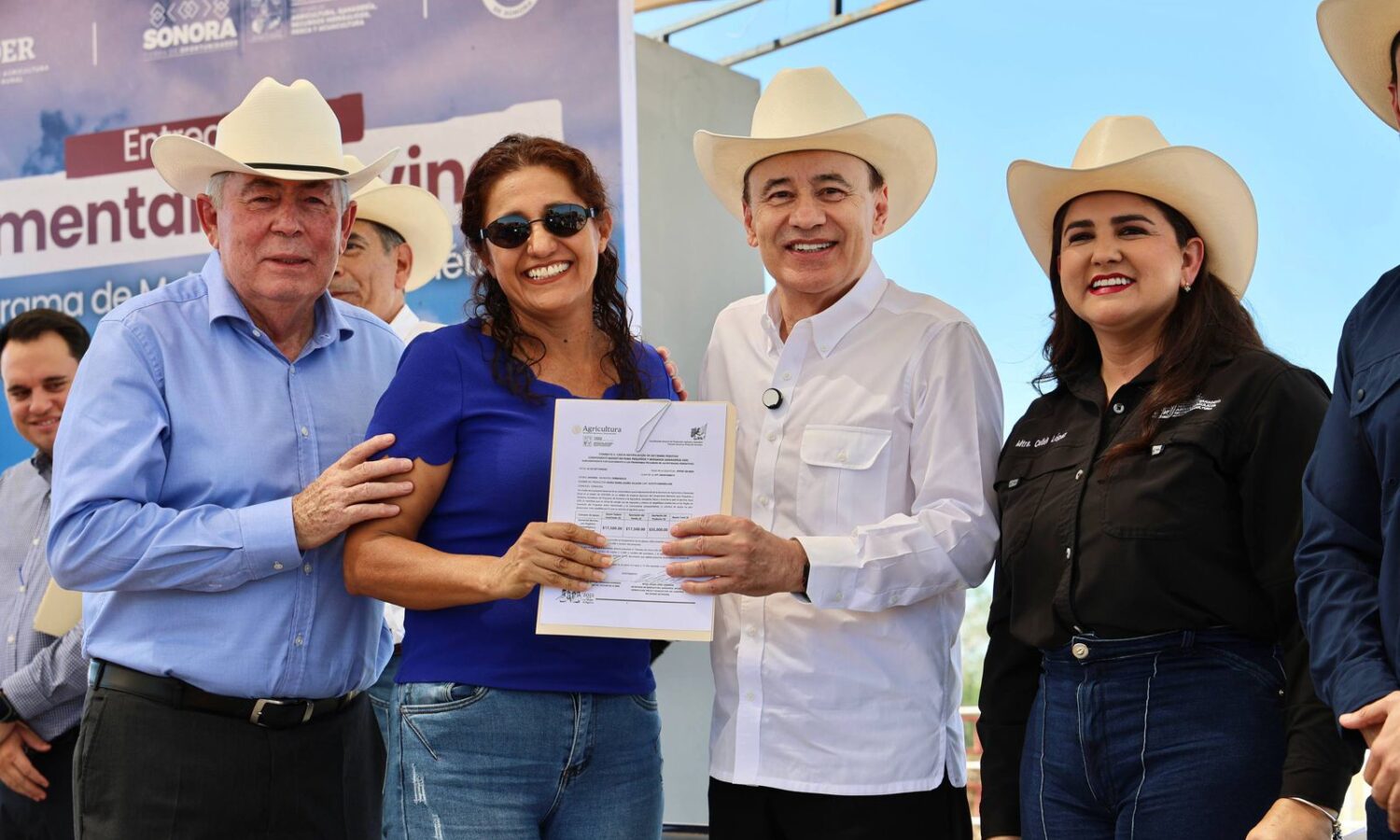 Estuvieron presentes: Leonel Cota Montaño, subsecretario de la Sader; Celida López Cárdenas, secretaria de Sagarhpa; Arturo Macosay Córdova, coordinador general de Ganadería del Gobierno de México; Juan Carlos Ochoa Valenzuela, presidente de la Unión Ganadera Regional de Sonora (UGRS); Juan Manuel González Alvarado, delegado de la Sader en Sonora; Yulia Valeria Guzmán Espinoza, directora general de Coordinación y Seguimiento; Fernando David Palos Ibarra, director general de vinculación interinstitucional; y Luis Alfonso Soto, representante de las y los productores.