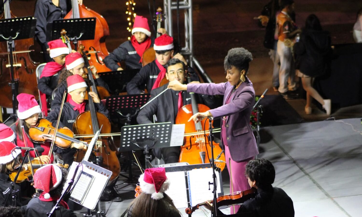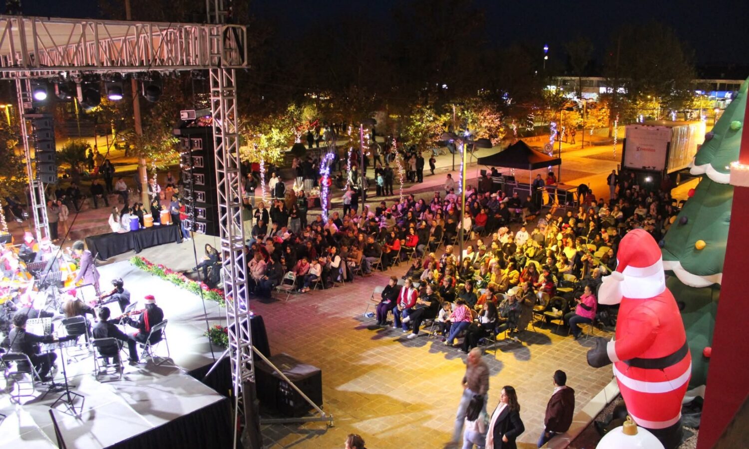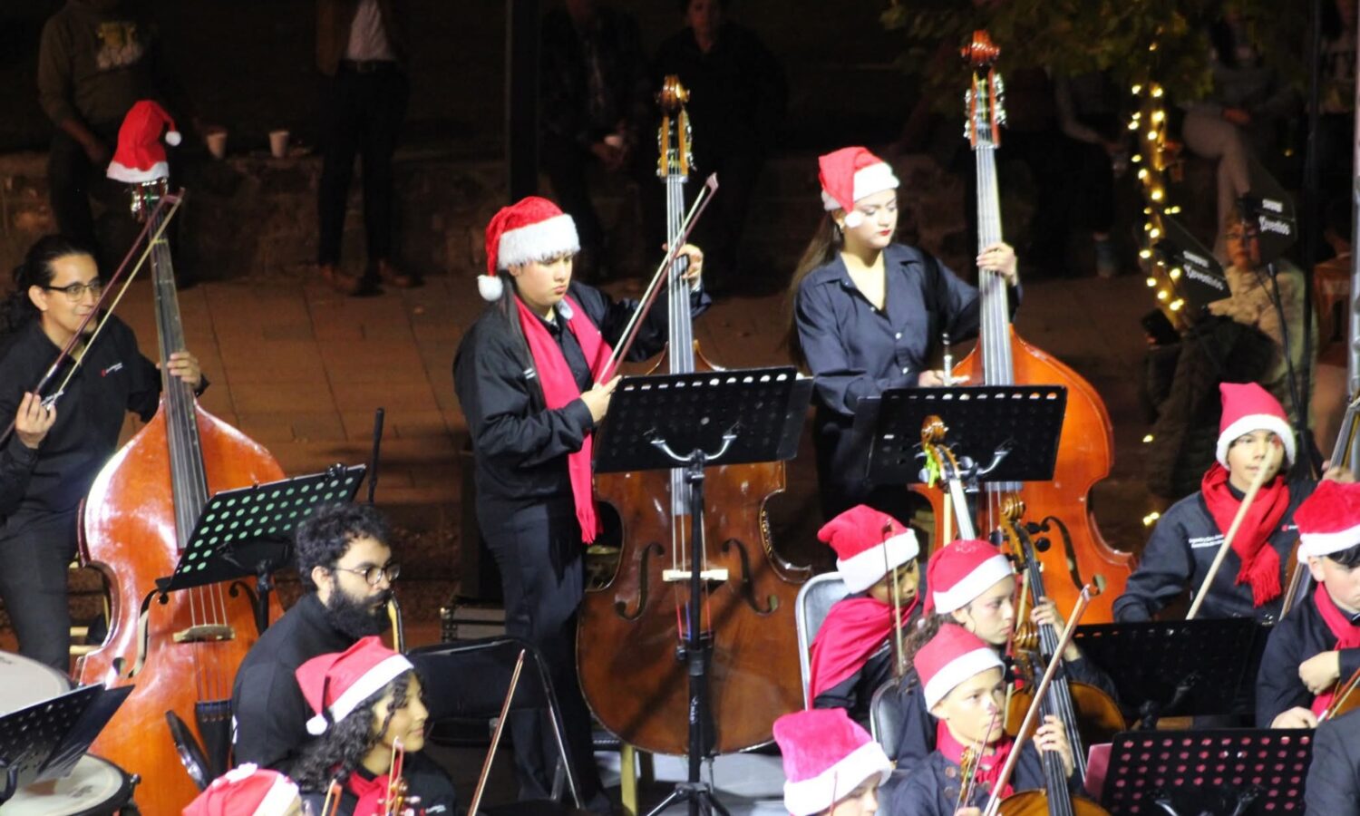 Cananea, Sonora, a 13 de diciembre de 2025.- La tarde de este viernes la Avenida Juárez se iluminó con el talento, música y vibrantes piezas que interpretaron los integrantes de la Orquesta y Coro Juvenil Buenavista del Cobre de Grupo México, además de la presentación de trabajos de los talleres de Desarrollo Comunitario y la Feria del Café.