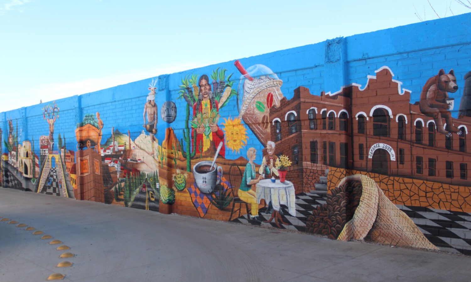 Hace apenas unas semanas terminó un mural de más 100 metros cuadrados en el área de pedidos a bordo del auto en Caffenio, donde plasmó diferentes aspectos de la cultura, flora y fauna sonorense, del café y de Cananea, su minería, su gente y emblemáticos lugares representativos de la ciudad del cobre, una labor que le tomó más de 120 horas de trabajo.