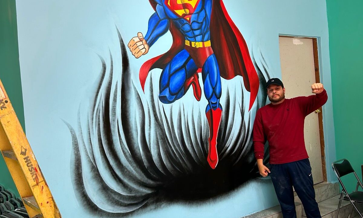 Cananea, Sonora, a 03 de febrero de 2026.- El pintor, rotulista y muralista cananense Luis Fuentes de la Torre sigue iluminando áreas de Cananea que convierte en su lienzo para plasmar ya sea la historia de la ciudad, cultura, animaciones o coloridas imágenes que emergen de su talento e inspiración.