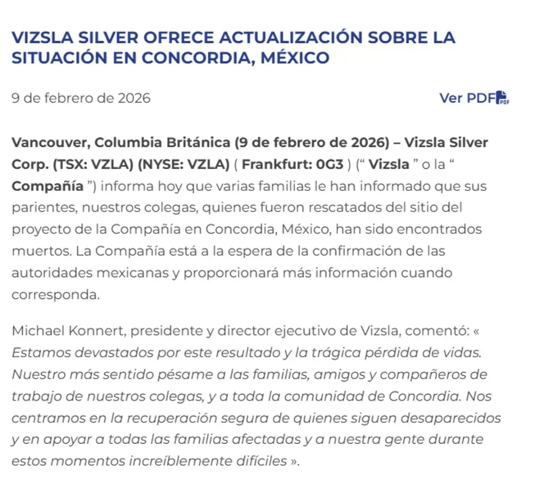 Sinaloa, a 09 de febrero de 2026.- Tras la desaparición de 10 trabajadores mineros en Concordia, Sinaloa, el pasado 23 de enero, la empresa minera canadiense Vizsla Silver informó que fue notificada sobre la localización sin vida de algunos de ellos, de los cuales hasta el momento se ha identificado la identidad de 5 de ellos.