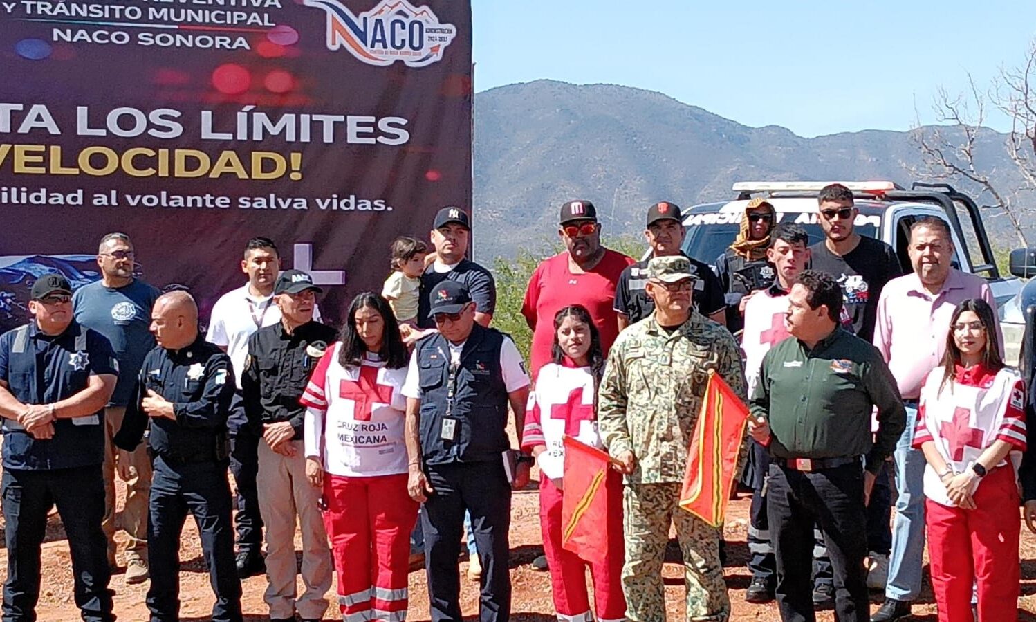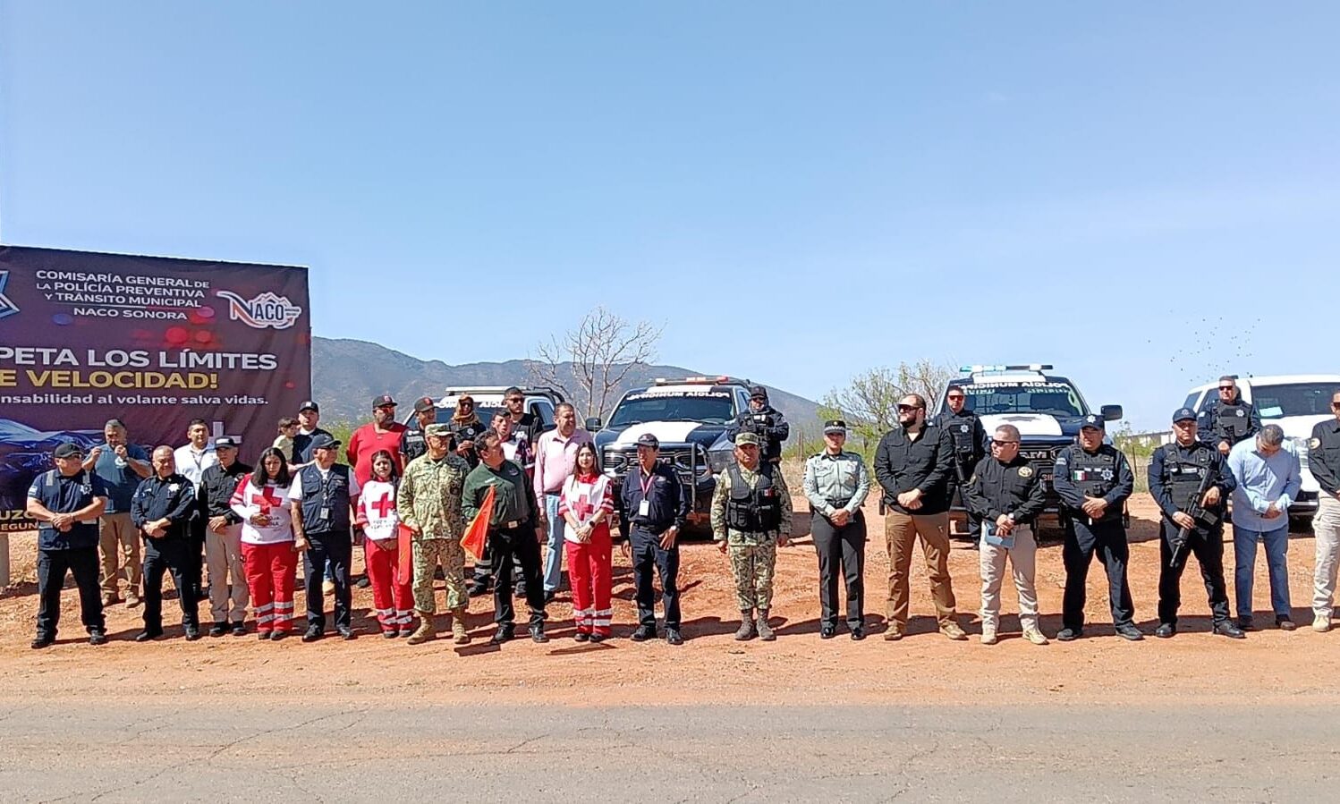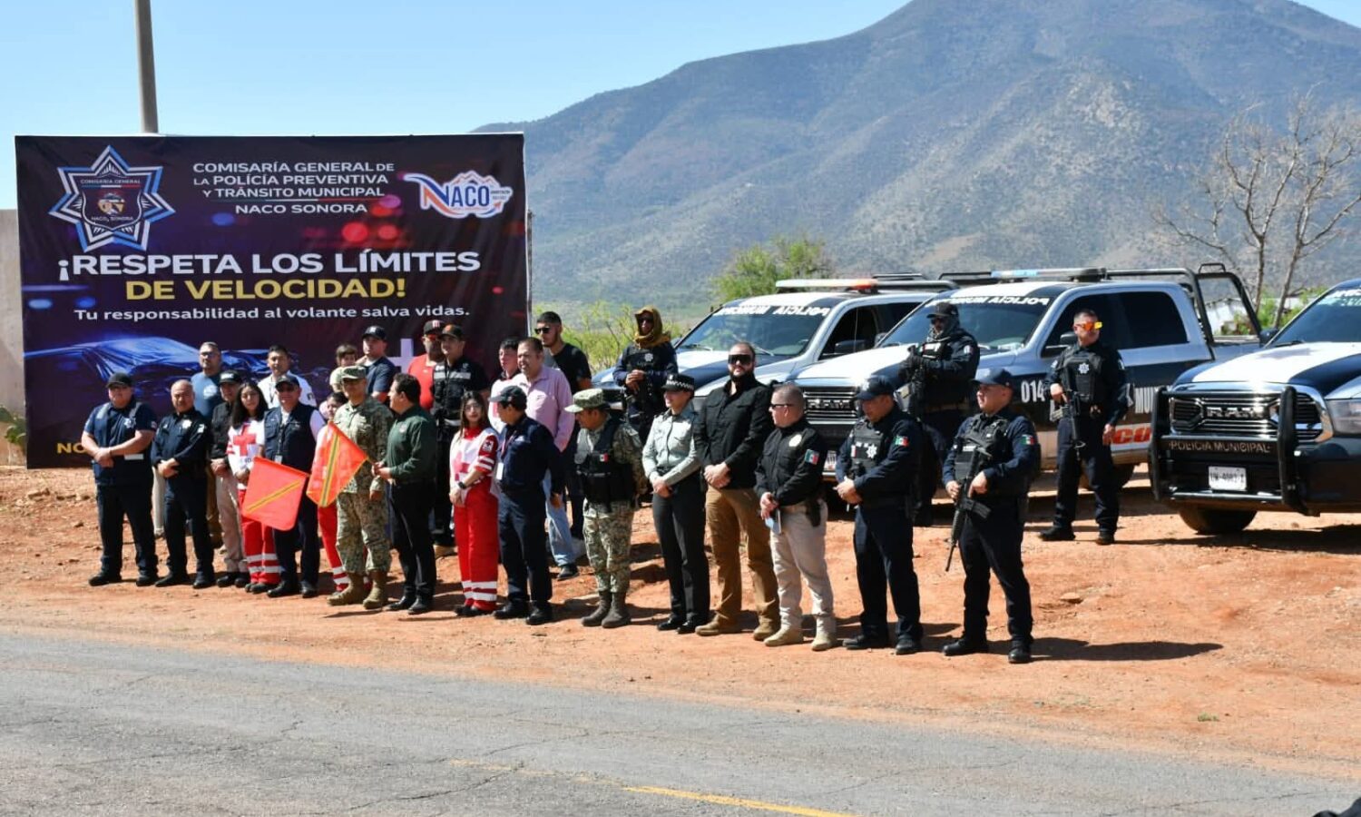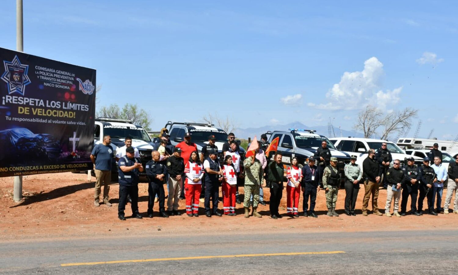Naco, Sonora, a 31 de marzo de 2026.- Este martes el Gobierno Municipal de Naco encabezado por el presidente municipal Lorenzo Villegas, dio el banderazo de arranque al Operativo Semana Santa 2026, con participación de corporaciones policíacas municipales y de los tres niveles de gobierno, SEDENA, Guardia Nacional, AMIC e instituciones de emergencia.